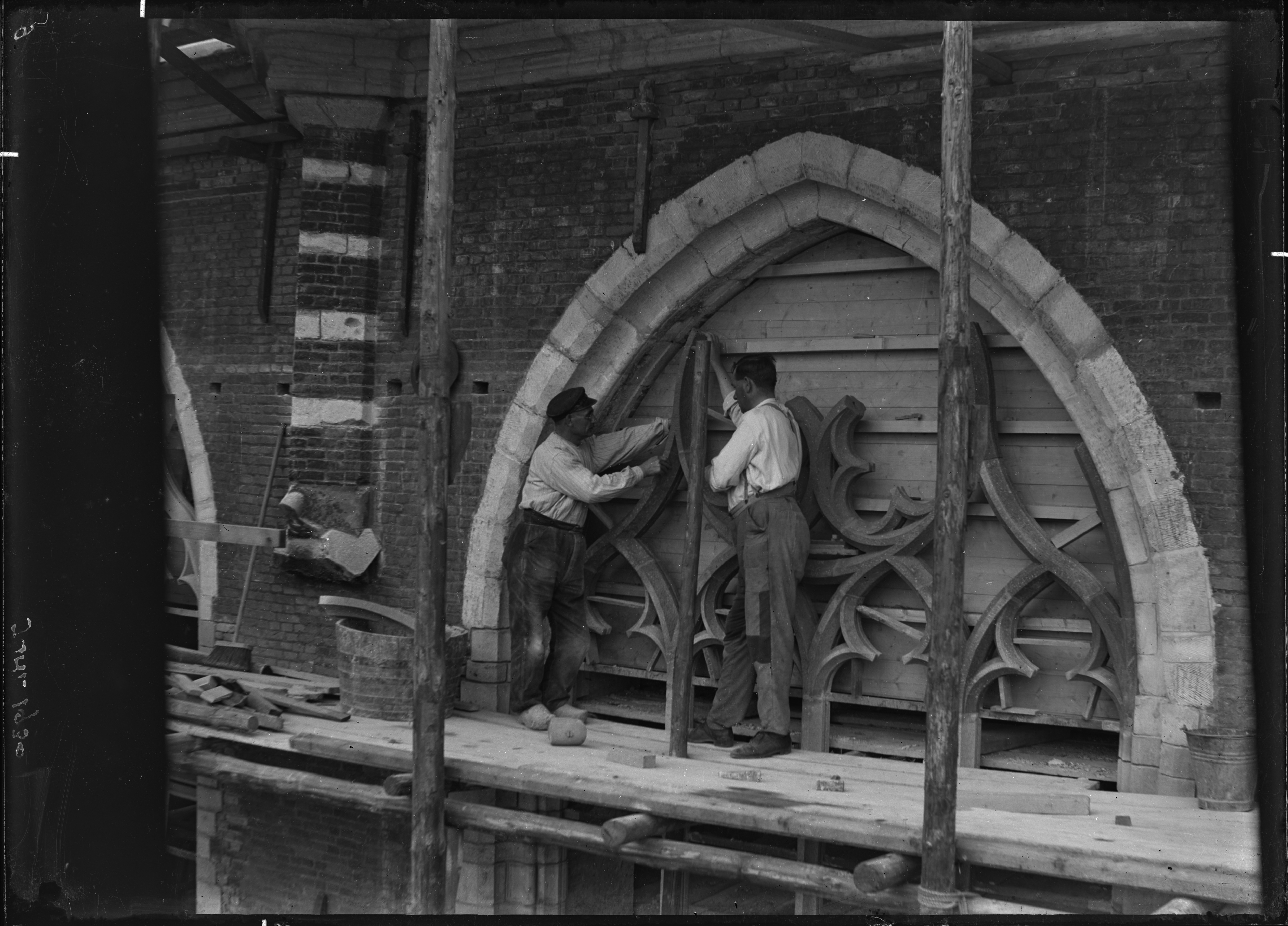 413.739): Stellen van natuurstenen vensterkop, tijdens restauratie.