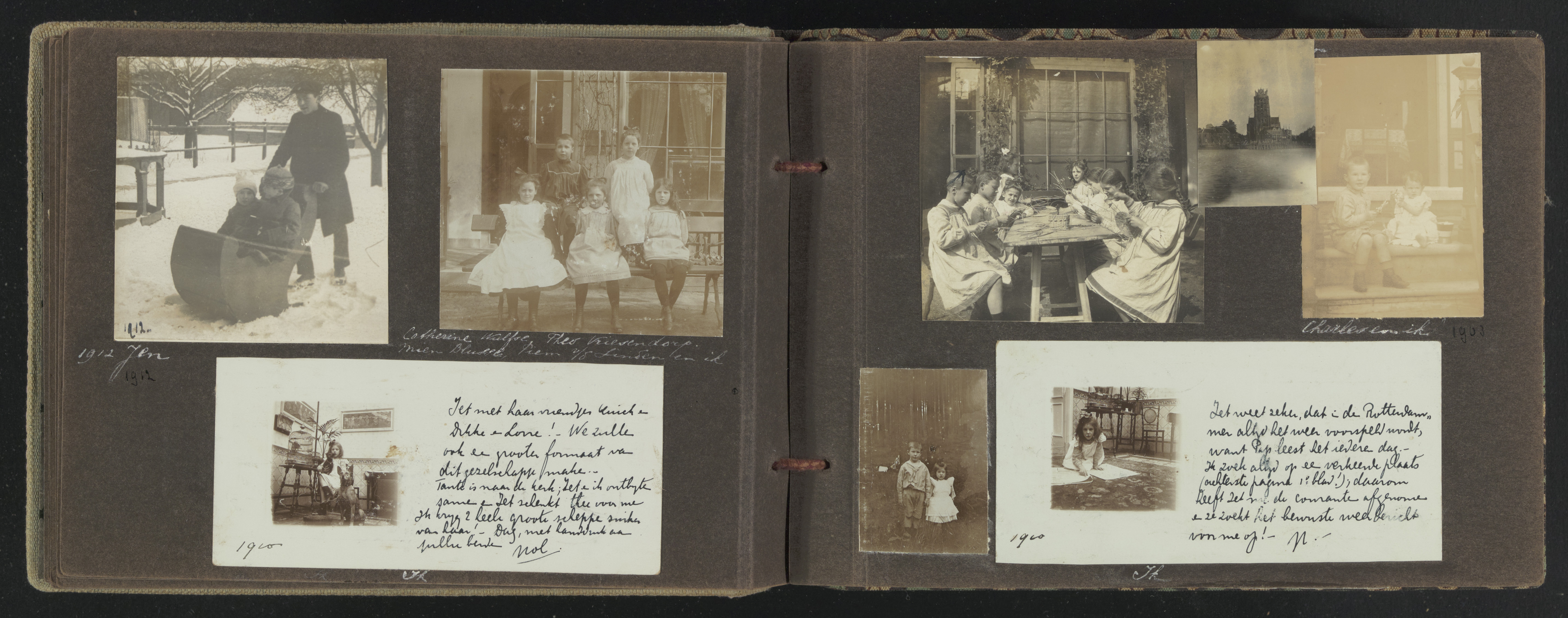 (fotoalbum Redelé) Charles en ik (1903) / Iet weet zeker dat in de Rotterdammmer altijd het weer voorspelt wordt, want Pap leest het iedere dag Ik zoek altijd op een verkeerde plaats (achterste pagina 1e blad) daarom heeft Iet me de couranten afgenomen en ze zoekt het bewuste weerbericht voor me op! (1910) / Catherine Kalfse, Theo Vriesendorp, Mien Blussé, Piem v/d Linden en ik / IET met haar vriendjes Kuich en Dikke en Lorre ! we zullen ook een grooter formaat van dit gezeldschap maken. Tante is naar de kerk, Iet en ik ontbijten samen en Iet schenkt thee voor me Ik krijg 2 heele groote scheppe suiker van jaar. Dag, met handdruk van jullie beide, Nol;