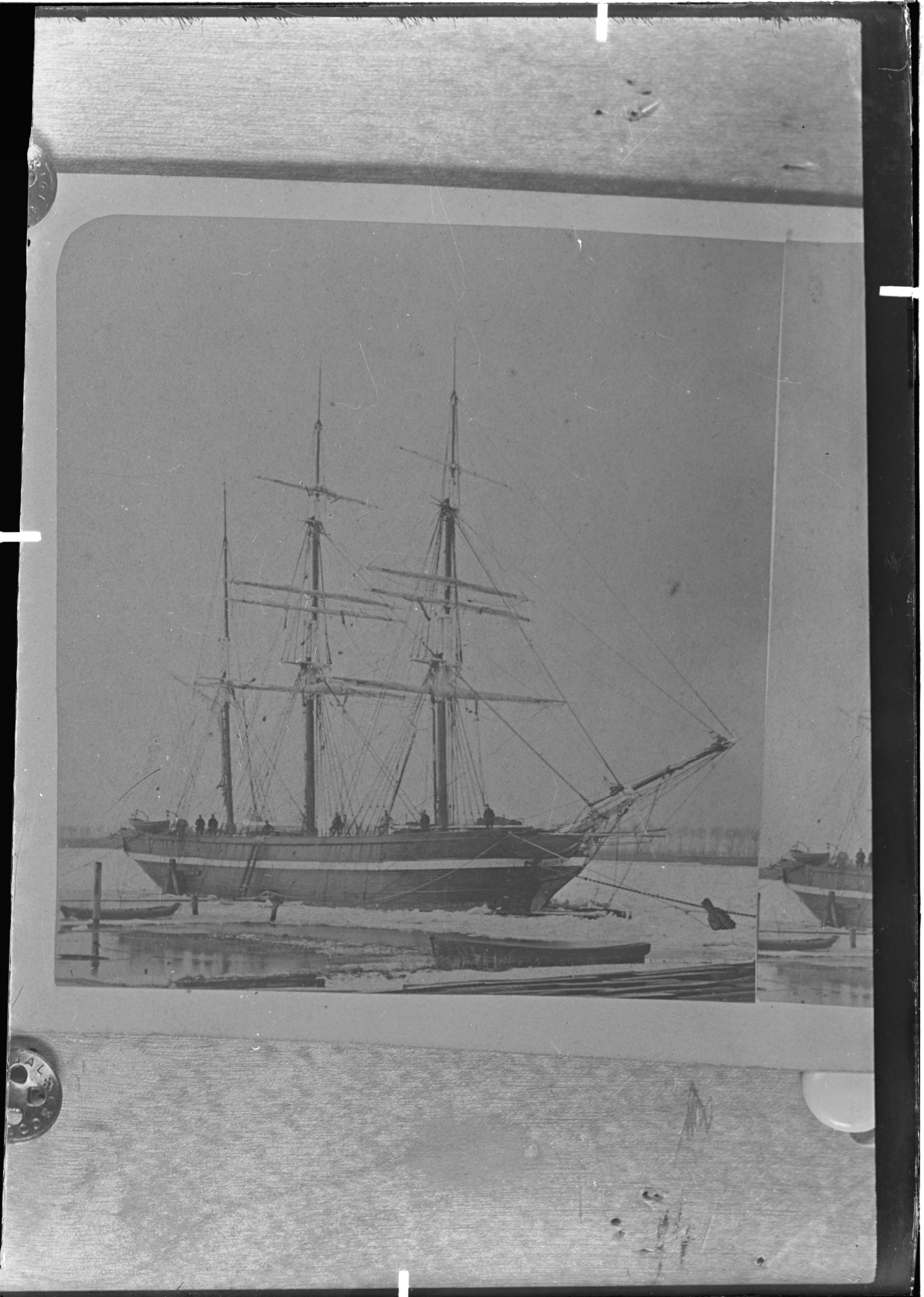 Linkerdeel van stereofoto 552_324203: Het barkschip Aegidia en Pauline in het ijs. Het voer onder rederij van G. van Hoogstraten en Zn als boekhouders te Dordrecht, 1865. Het schip met een tonnenmaat van 747 werd in 1865 gebouwd op de werf van Chr. Gips.