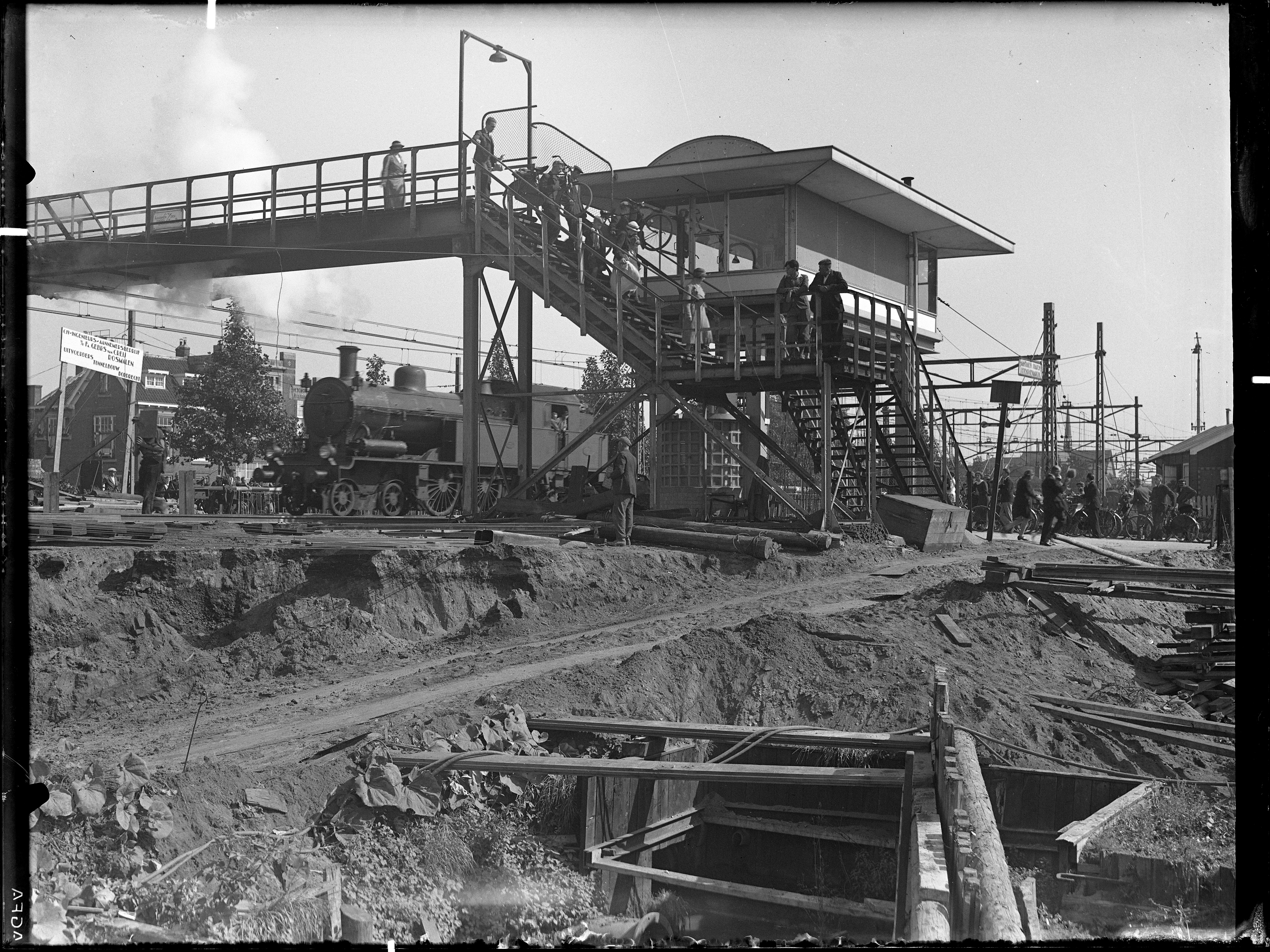 Seinhuis en voetgangersbrug over het spoor tijdens de bouw van de Krispijntunnel.