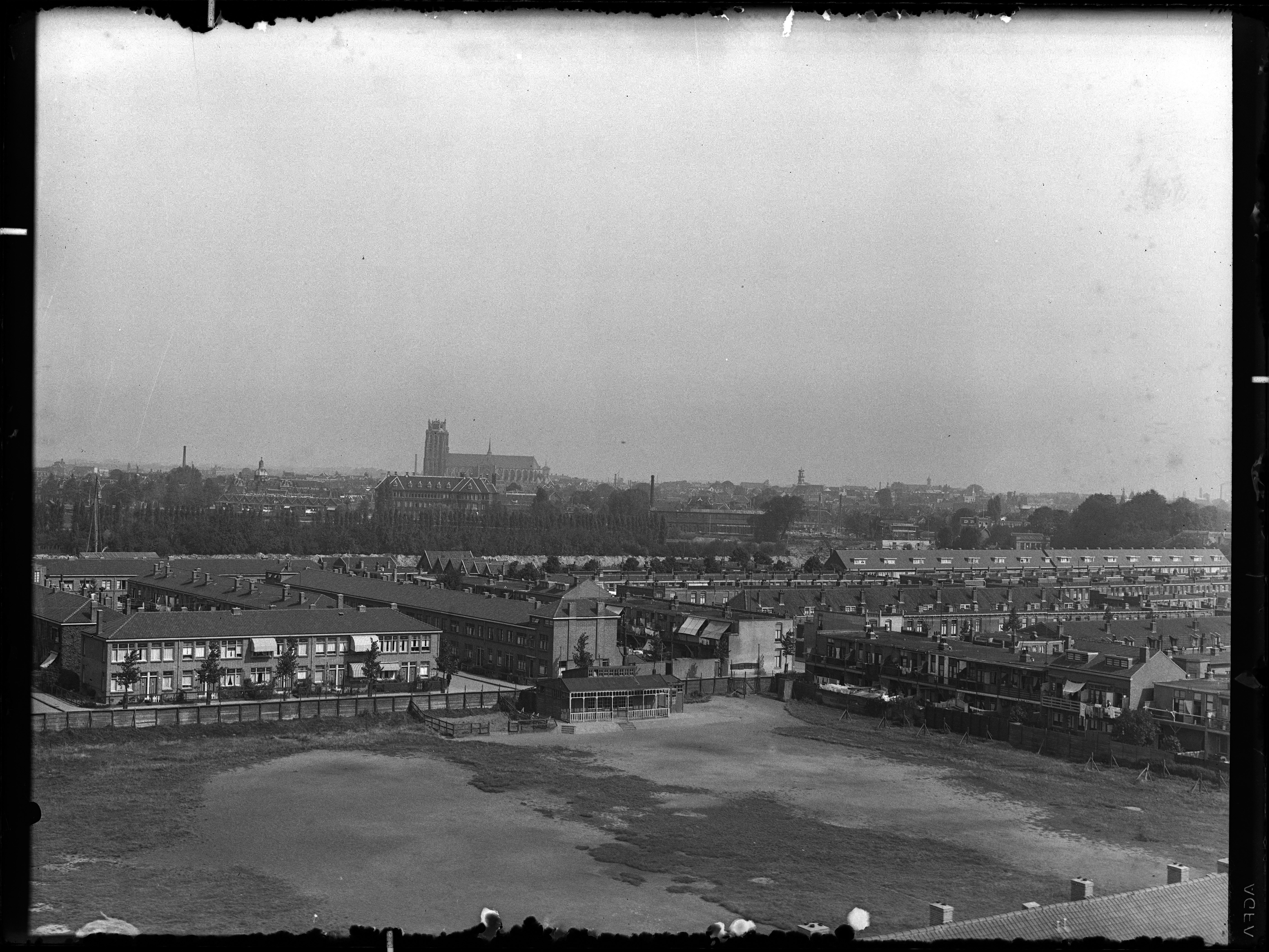 Het sportterrein heeft vanaf 1915 bestaan toen men besloot het voor 2000 gulden op te hogen en voor 1000 gulden te omheinen. Hadden ze voor het ophogen maar wat meer vrijgemaakt, want het was al die jaren een treurspel op dat veld doordat er vanwege wateroverlast niet op te spelen was. Parallel aan het sportterrein de Jacob Catsstraat. De eerste zijstraat links is de Vossiusstraat, de tweede de Camphuijzenstraat. Deze twee straten zouden worden doorgetrokken in het voormalig sportterrein. Rechts de Tesselschadestraat. Voor de Grotekerk het gebouw van de Verzekeringmaatschappij Dordrecht aan de Bellevuestraat later Refaja. Rechts daarvan de voormalige Lips brandkastenfabriek waarop dit moment van de foto de Centrale Werkplaats in gevestigd was. (Er zijn ook plannen geweest dat die hier op het sportterrein zou komen). Daarop volgend hei-installaties t.b.v. de Krispijntunnel.