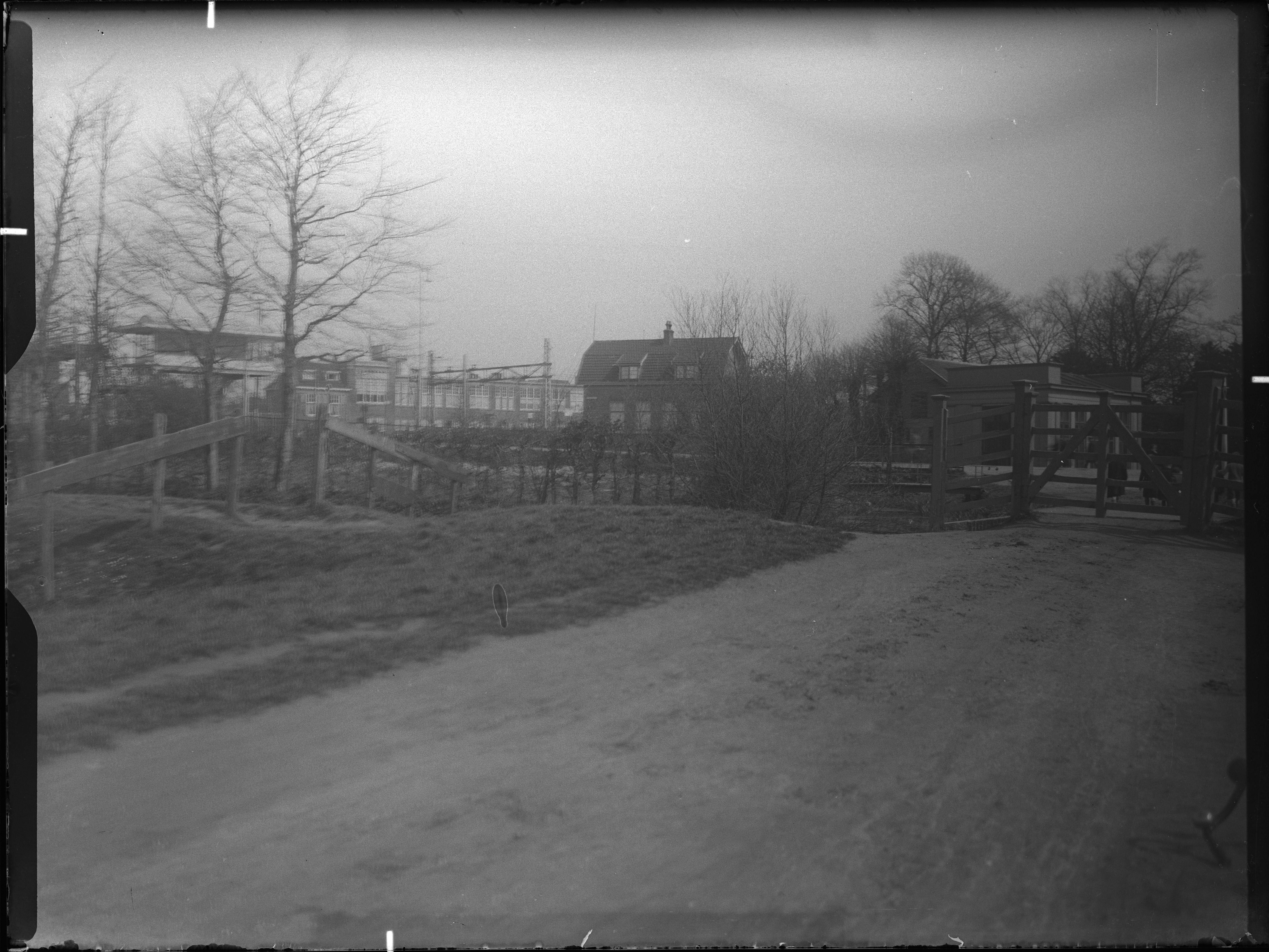 Het hek van de Watermolenweide, aan de overkant van de weg een bijgebouw van Villa Weizigt aan de Krispijnseweg.