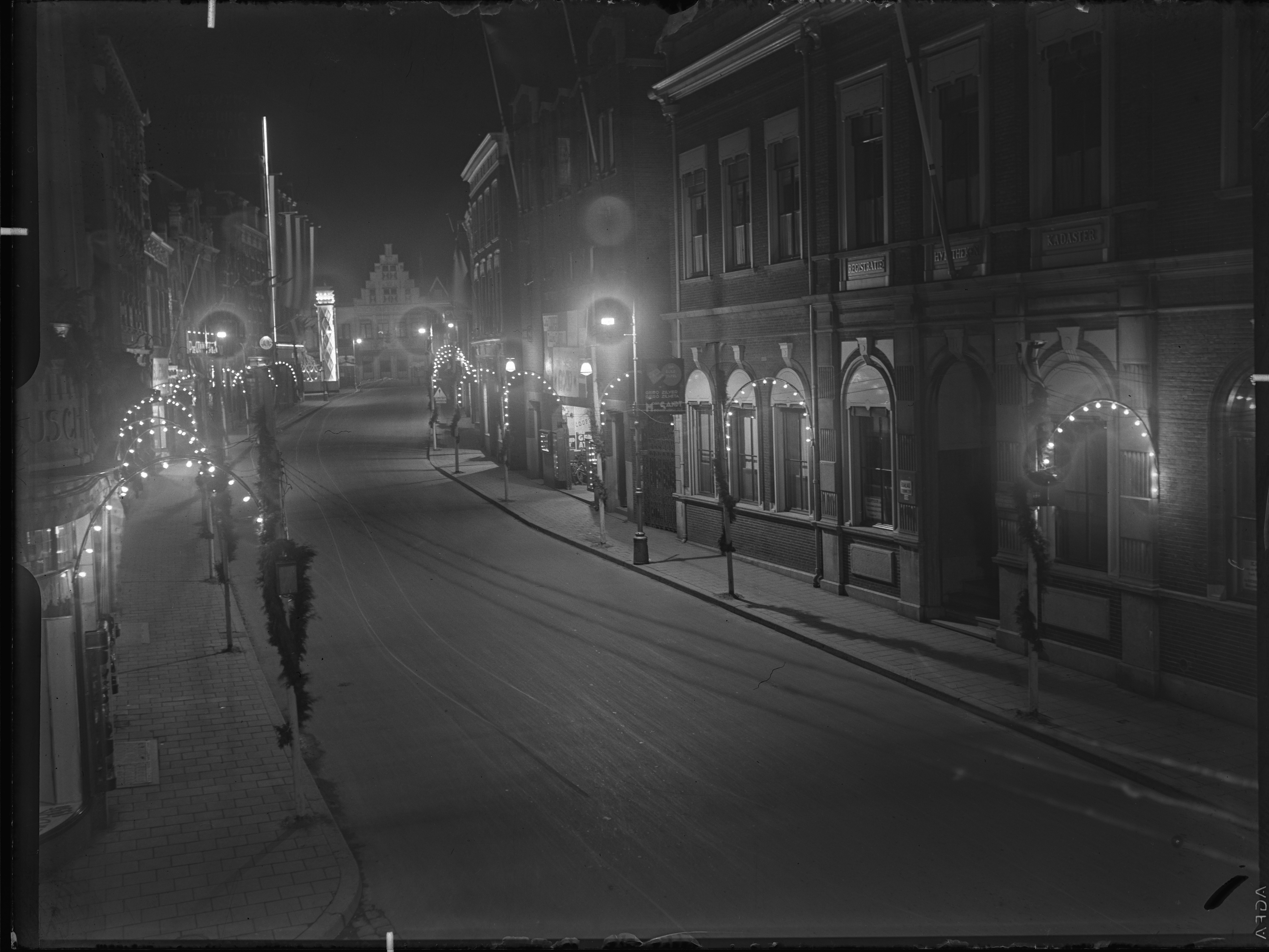 - Feestverlichting in de Visstraat richting, gezien vanaf het kadaster (rechts) richting Groenmarkt.