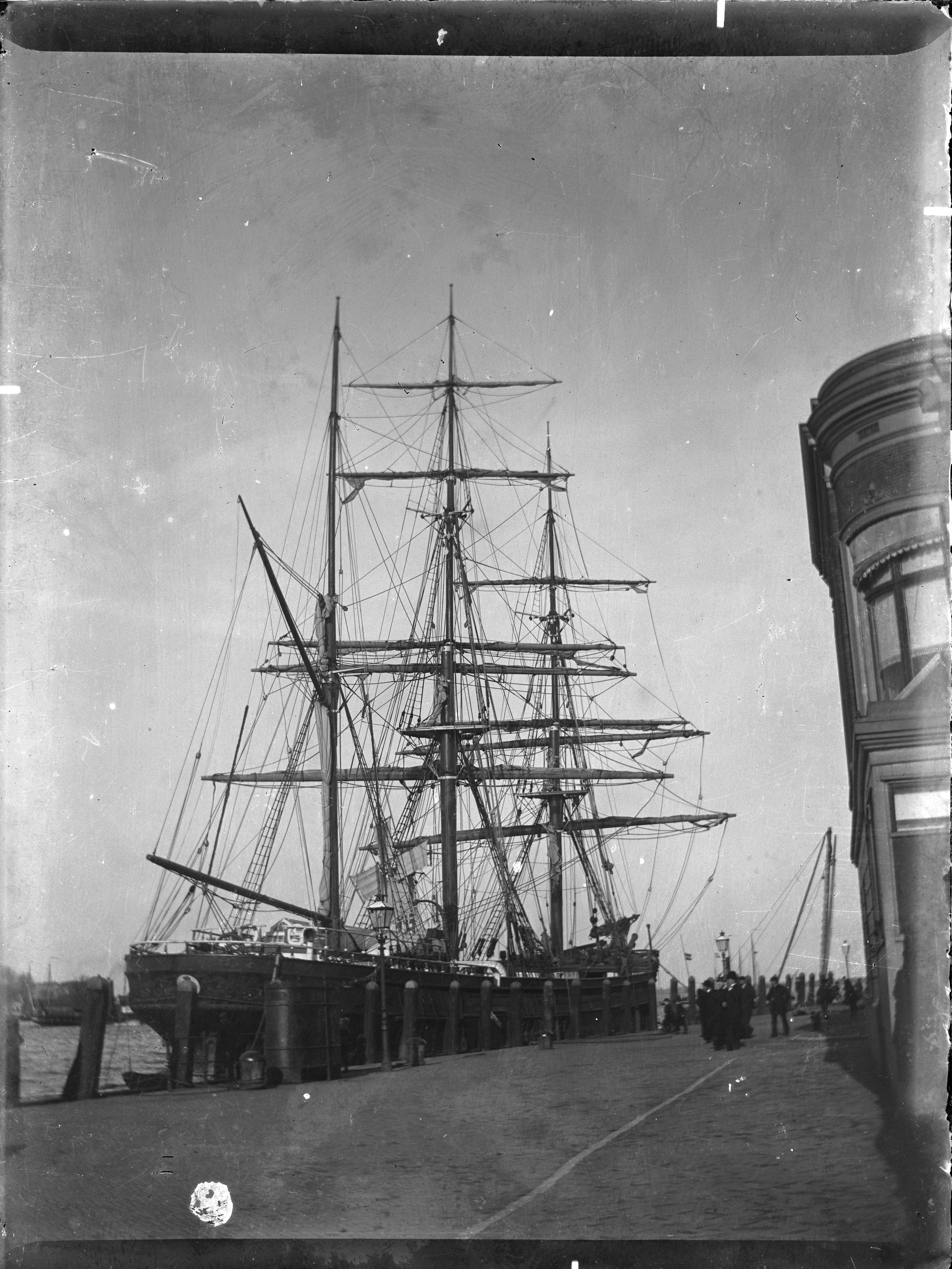 driemaster liggende aan kade (Merwekade)