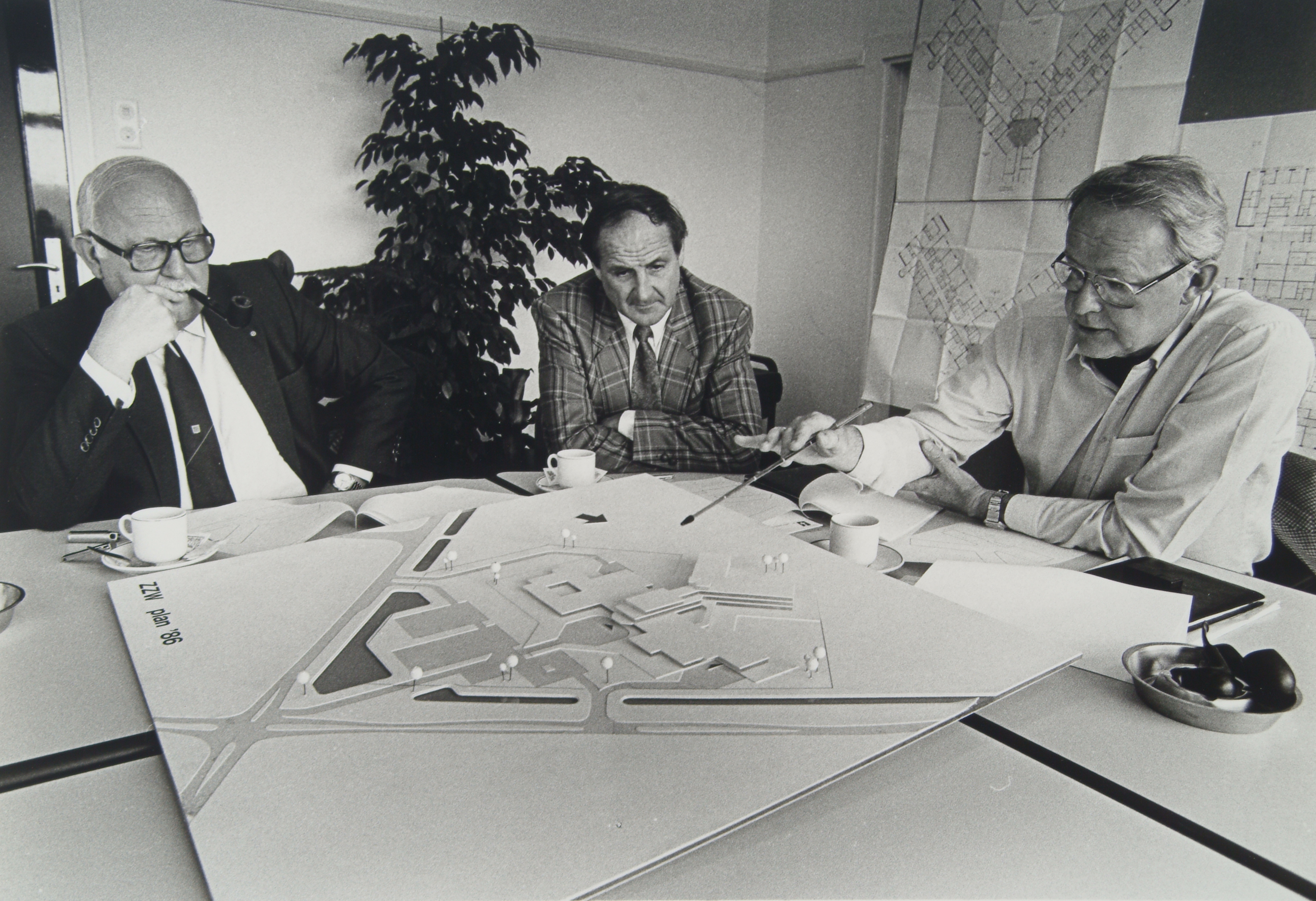 - Burgemeester Pijl Hogeweg van Zwijndrecht en de heren Wevers en De Haan van het RK-ziekenhuisbestuur bekijken een maquette van het te bouwen Jacobus ziekenhuis aan de Langeweg te Zwijndrecht