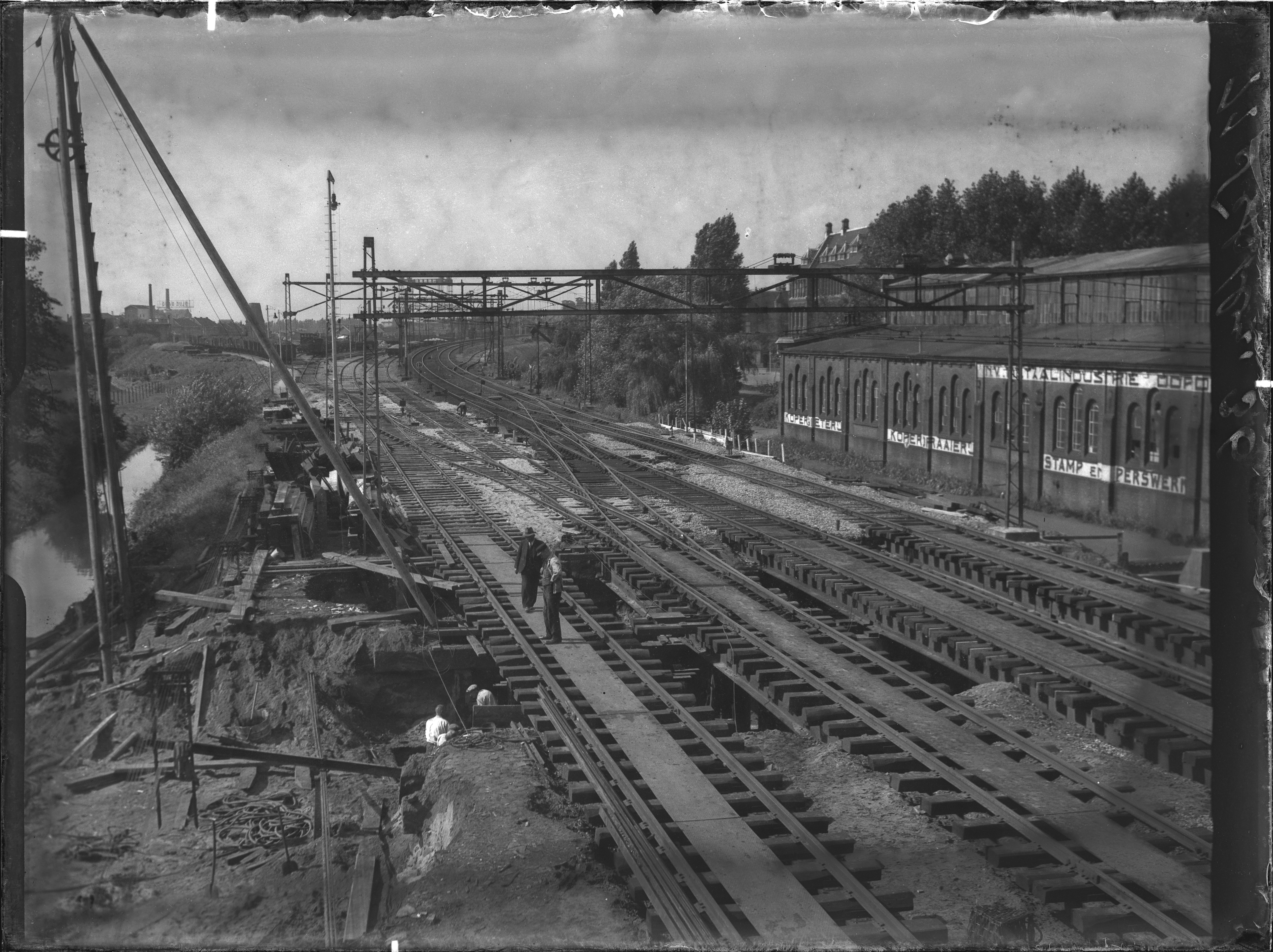 - Bouw van de Krispijntunnel onder de spoorbaan. Rechts de oude fabriek van Lips op de hoek van de Spuiweg.