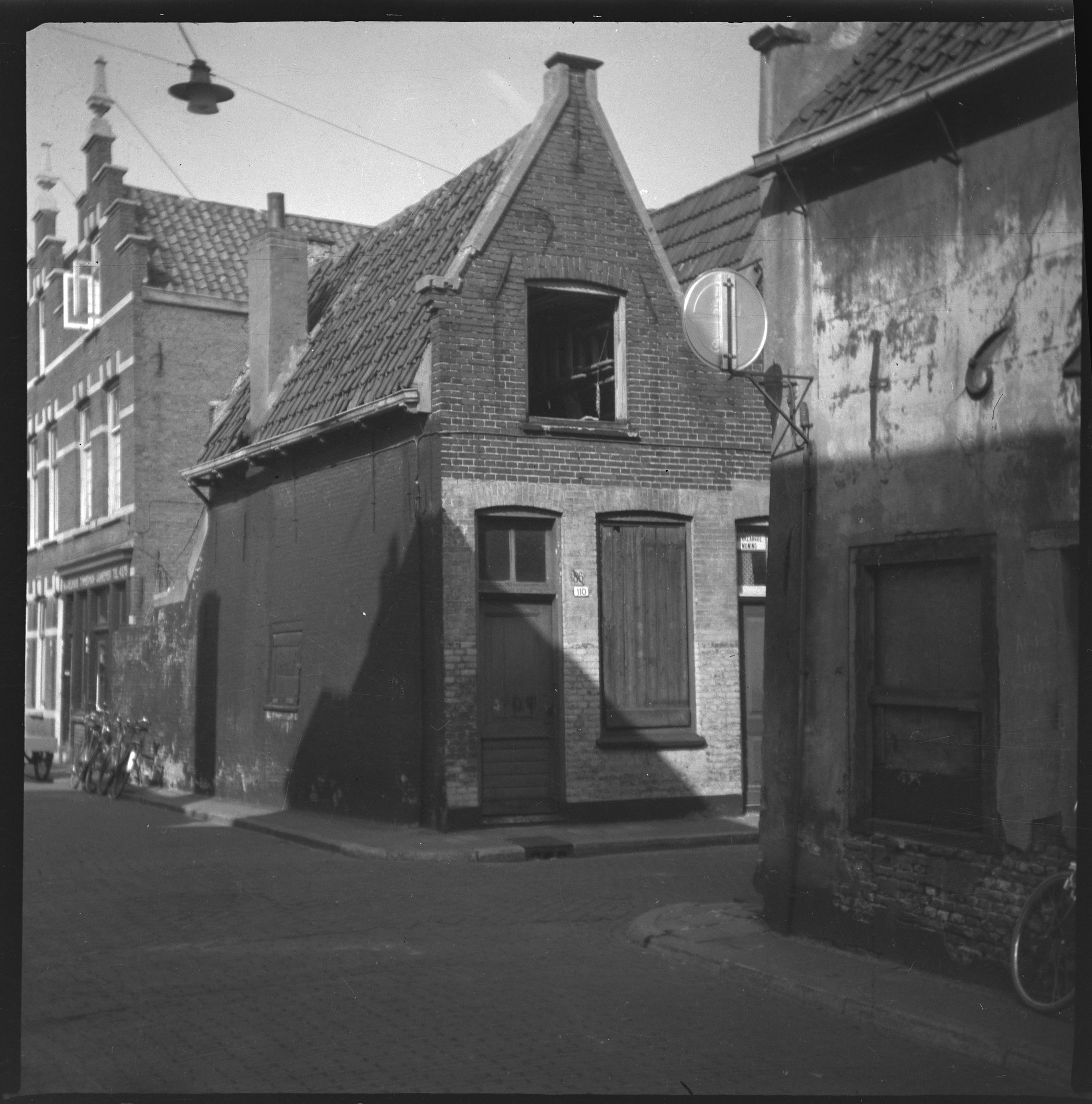 - Onbewoonbaar verklaard huisje op de noordoostelijke hoek van de Veststraat (links) en de Mariënbornstraat. Links bedrijfspand van timmerman aannemer N. te Veldhuis.