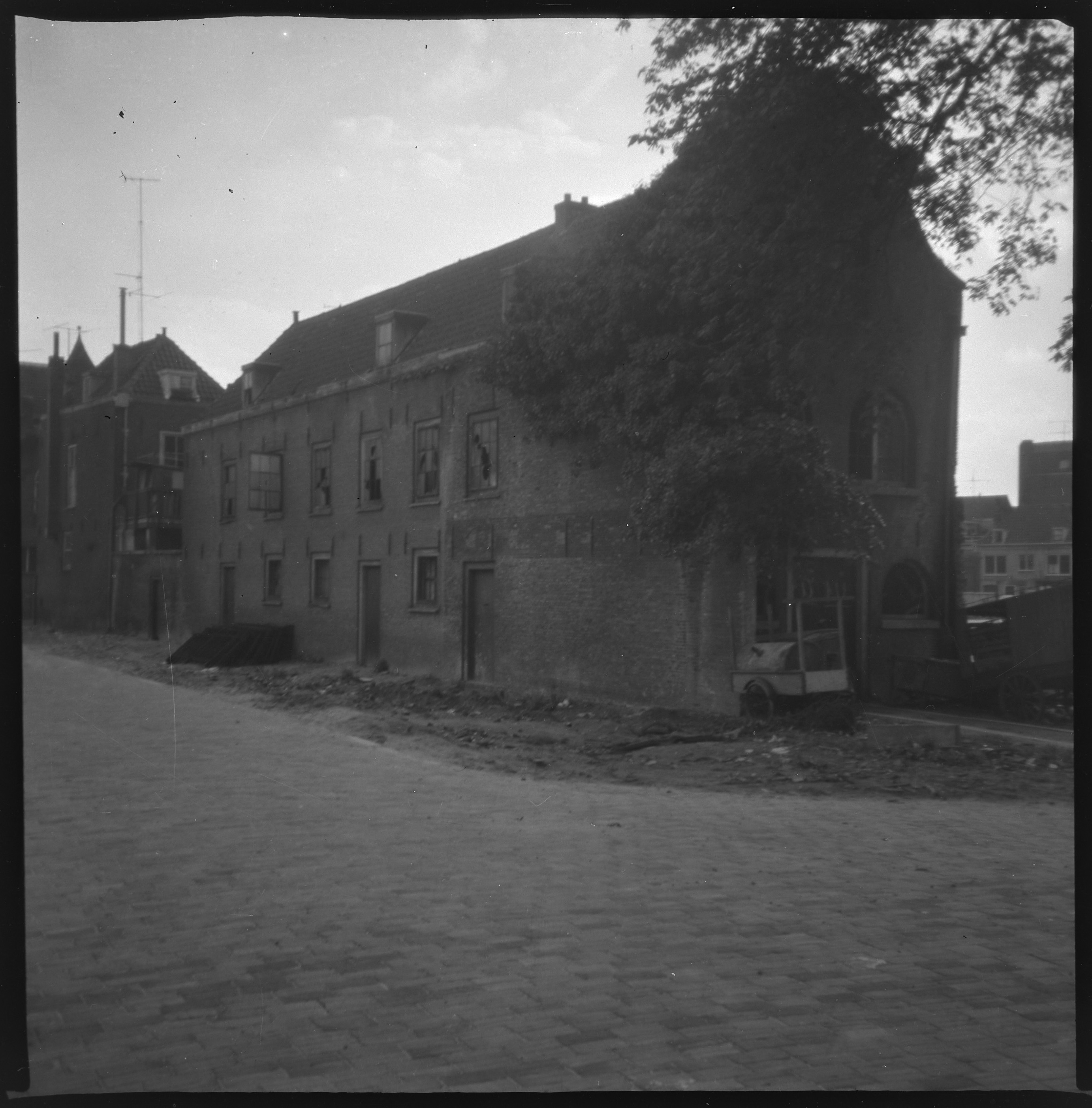 - Een pakhuis aan de zuidoostzijde van de Varkenmarkt, Doorkijkje over de Vismarkt naar de Nieuwe Haven.