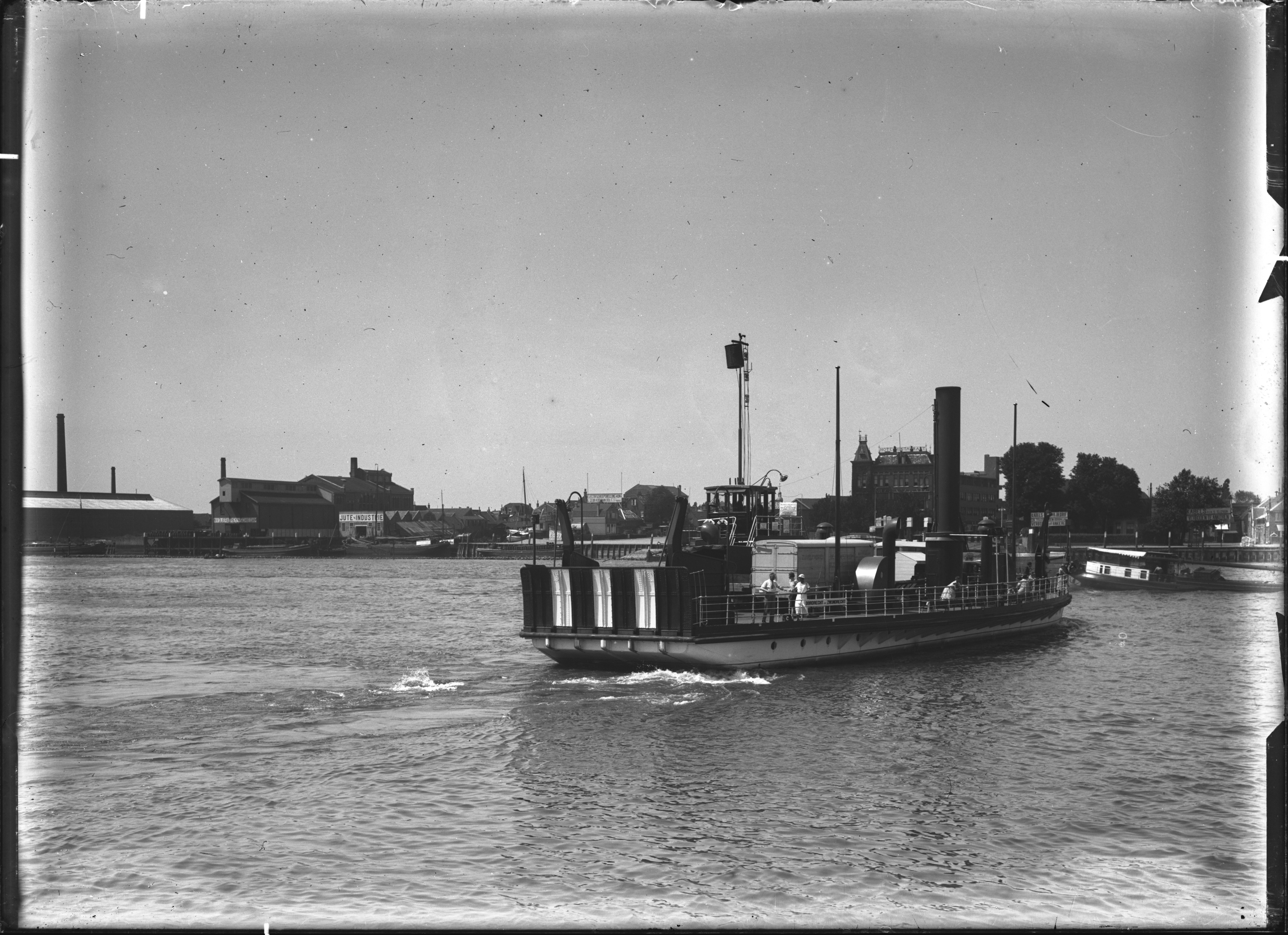 Veerboot op de Oude Maas. Rechts van het midden hotel Het Witte Paard in Zwijndrecht.