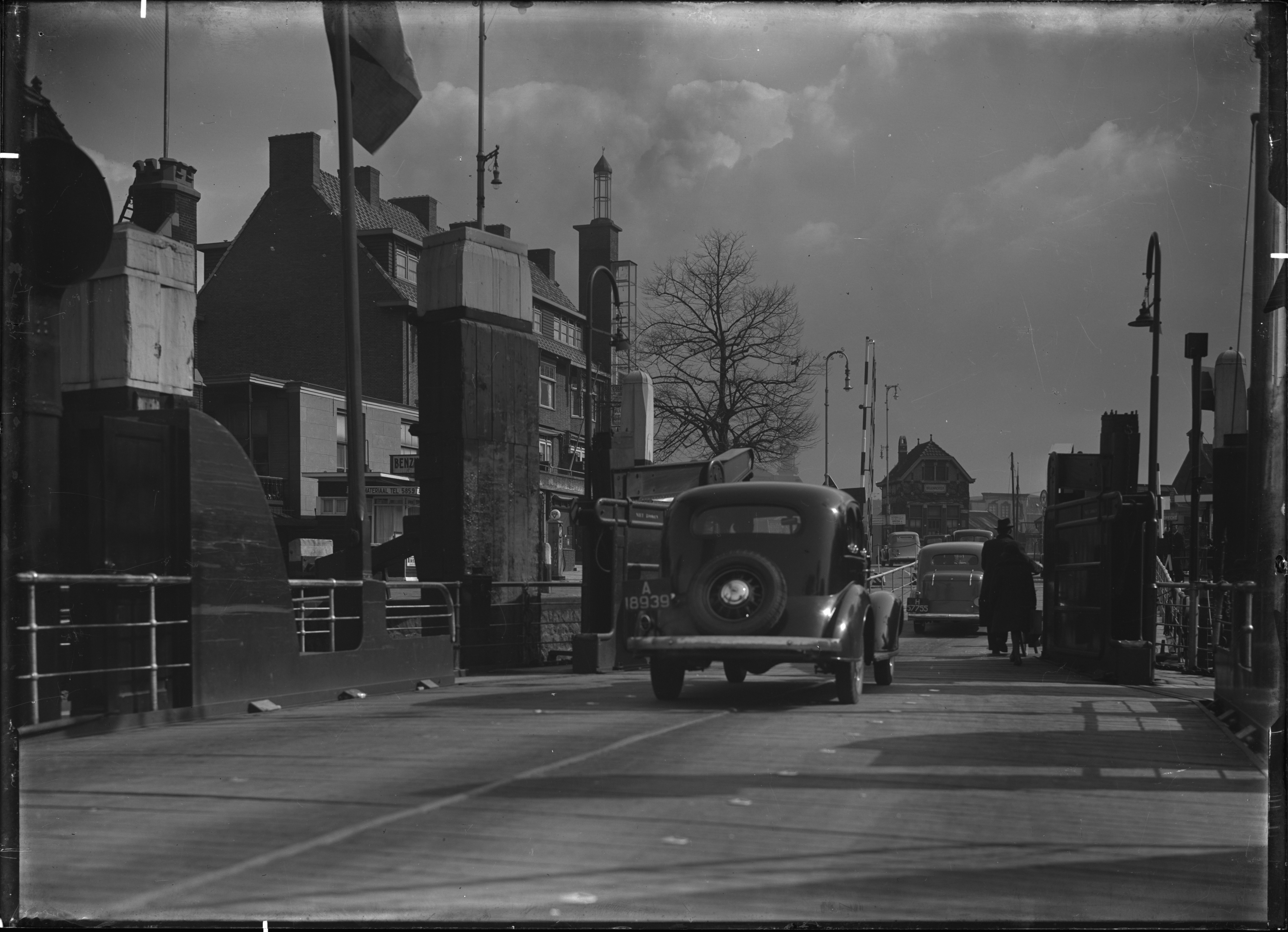 brug; automobiel A18939 en H57755; brugwachtershuis;