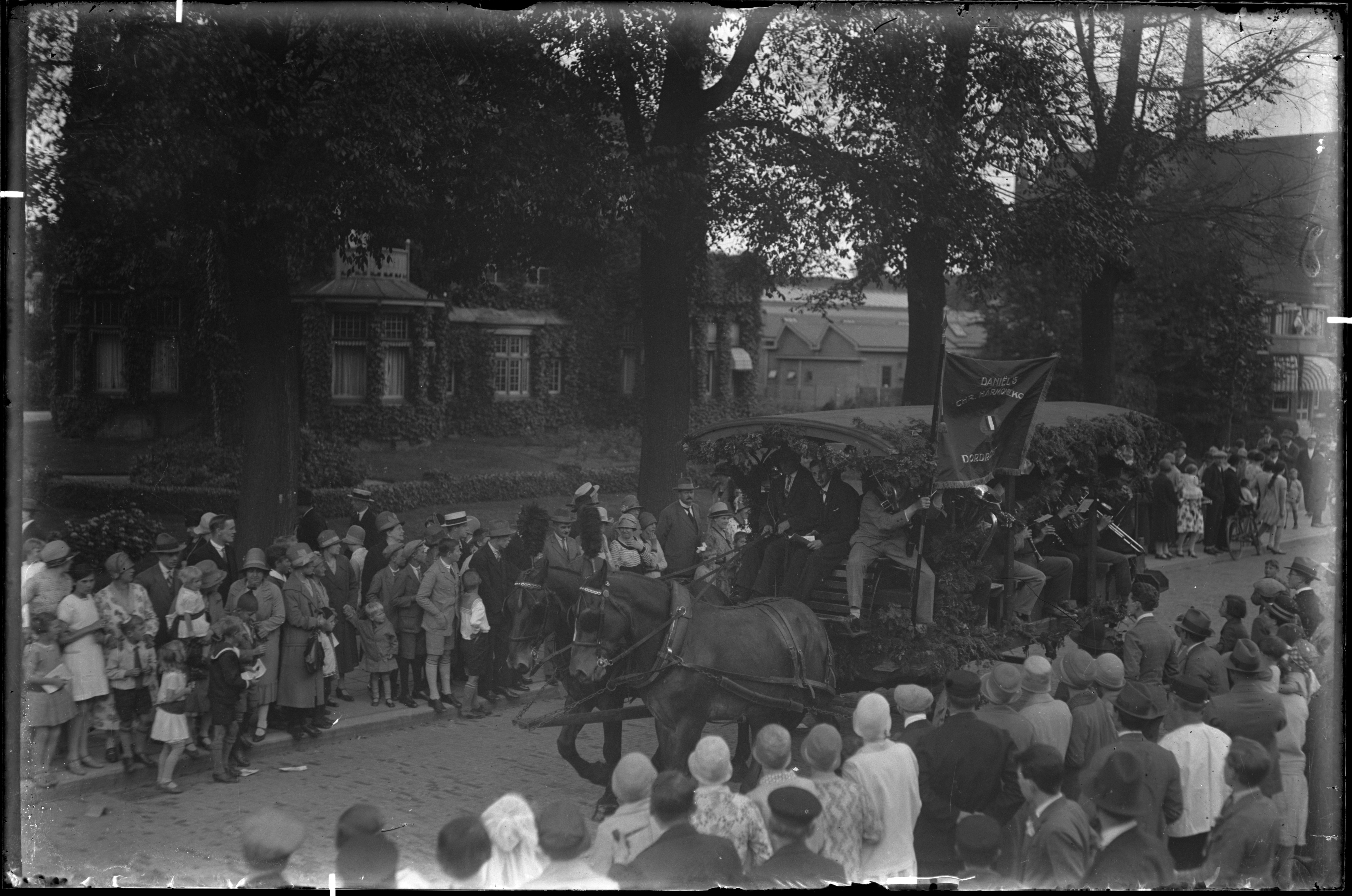 vaandel "Daniëls Chr. Harmoniekorps, Dordrecht" ----------- zie 552_701561 "Optocht met versierde rijtuigen op Burgemeester de Raadtsingel. Geheel links villa Simpang op de hoek van de Stationsweg."