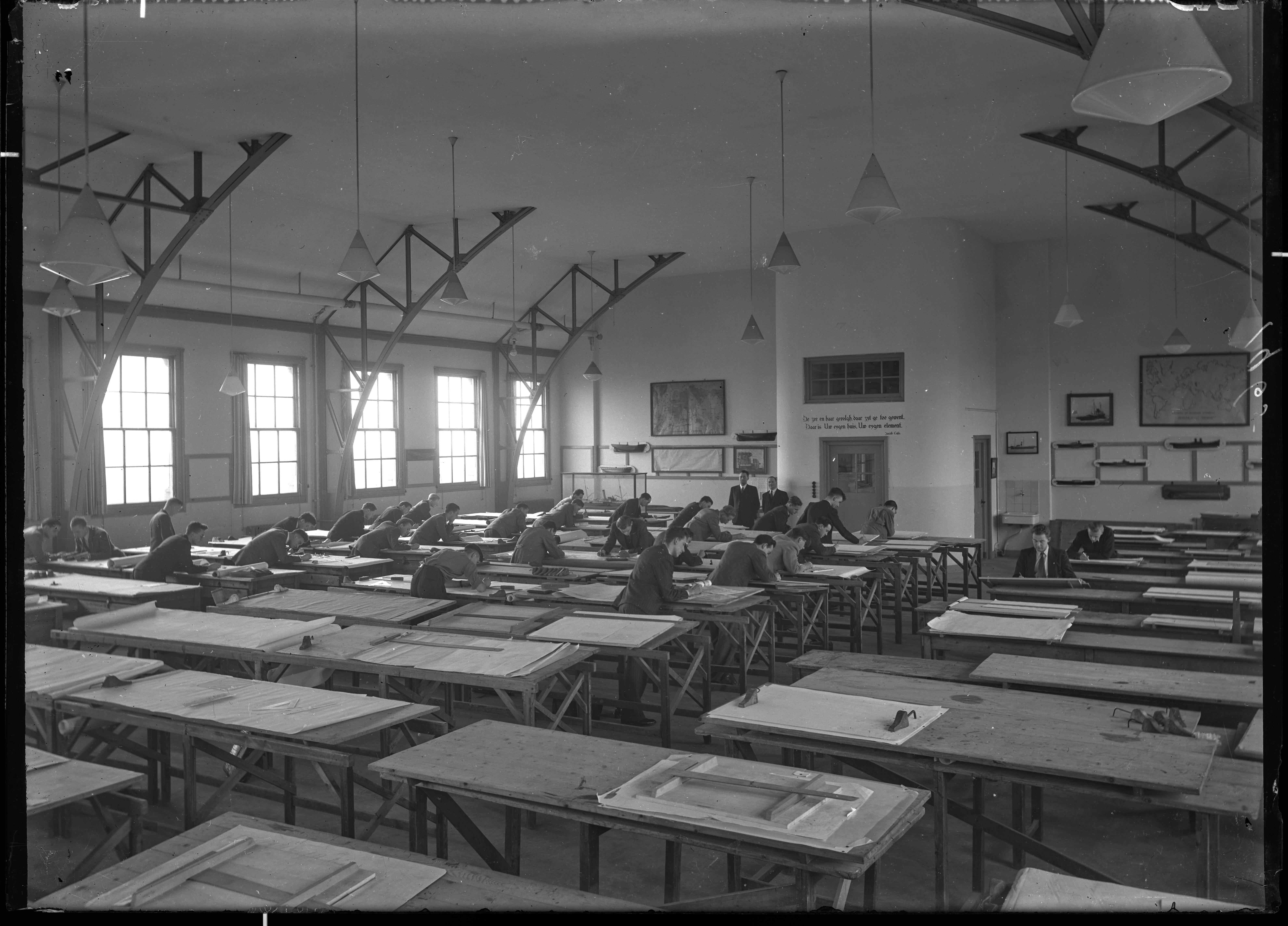 tekenlokaal, leerlingen scheepbouwkundigen (spreuk Jacob Cats:'De zee en haar gevolgh daer zijtge toe gewent, Daer is uw eygen huis, uw eygen element')