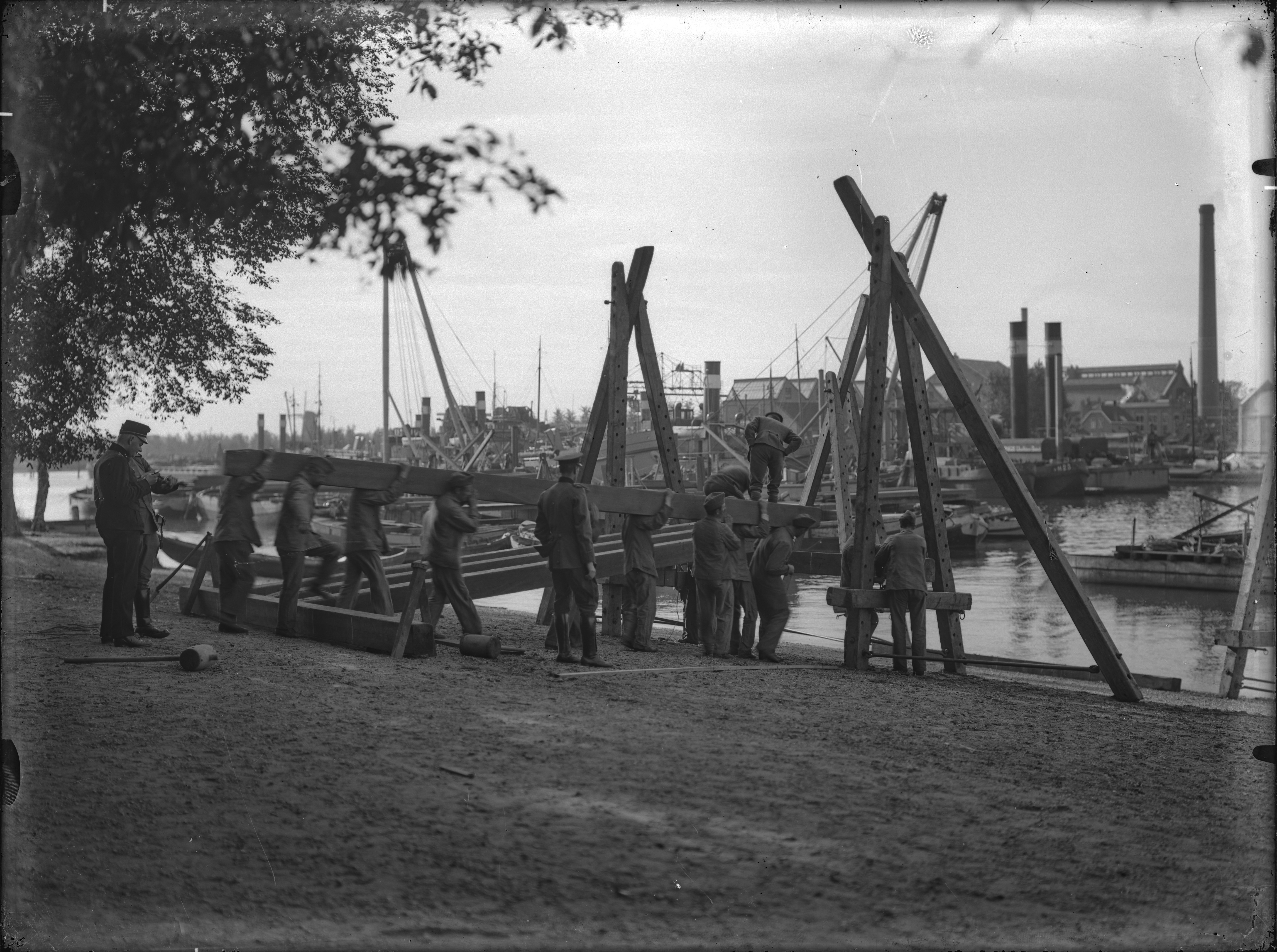 - Pontonniers bouwen een pontonbrug vanaf de punt van de Staart over het Wantij richting de Lijnbaan.