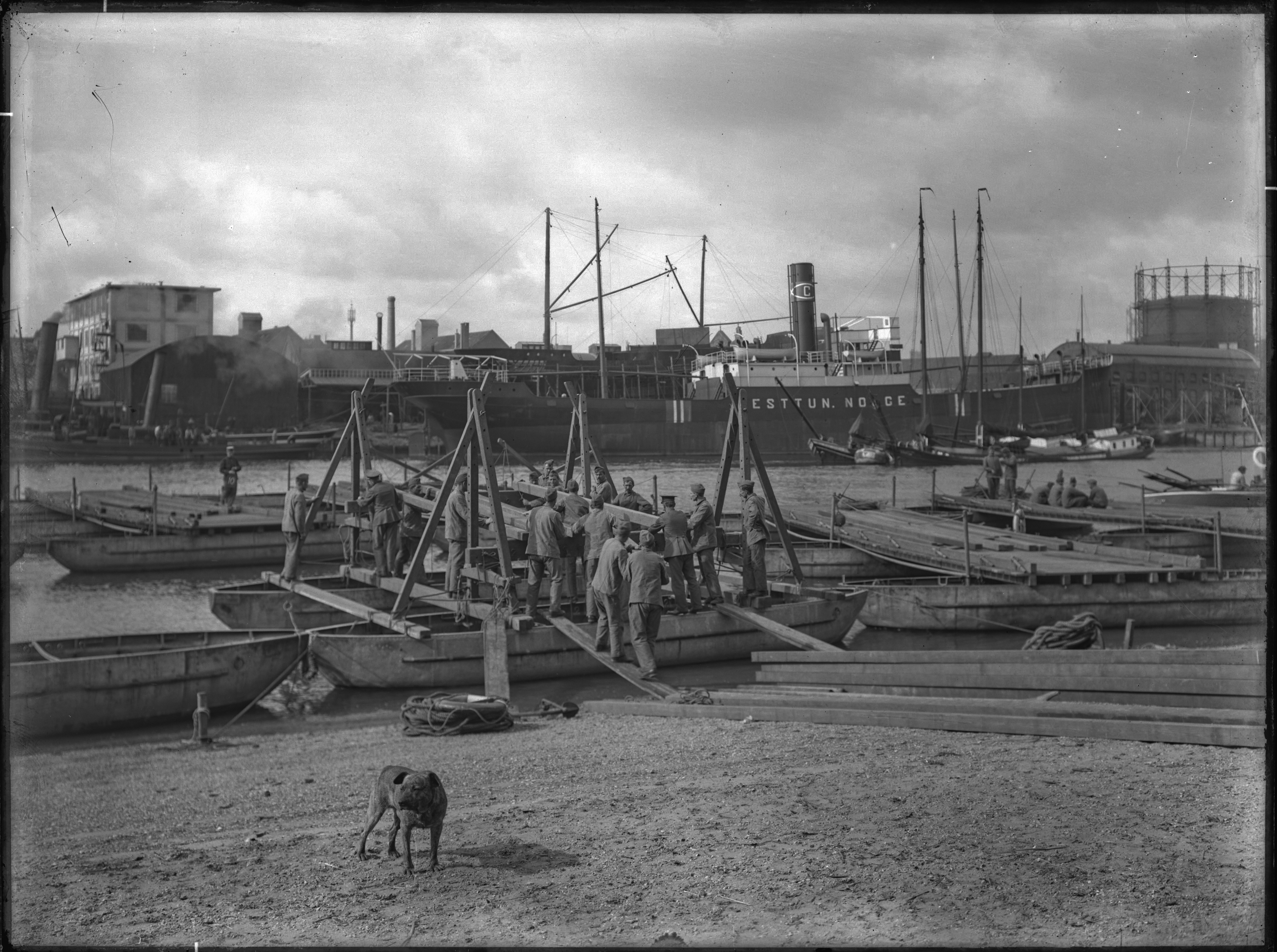 Pontonniers op het oefenterrein aan de de punt van de Staart. De gashouder staat aan de …