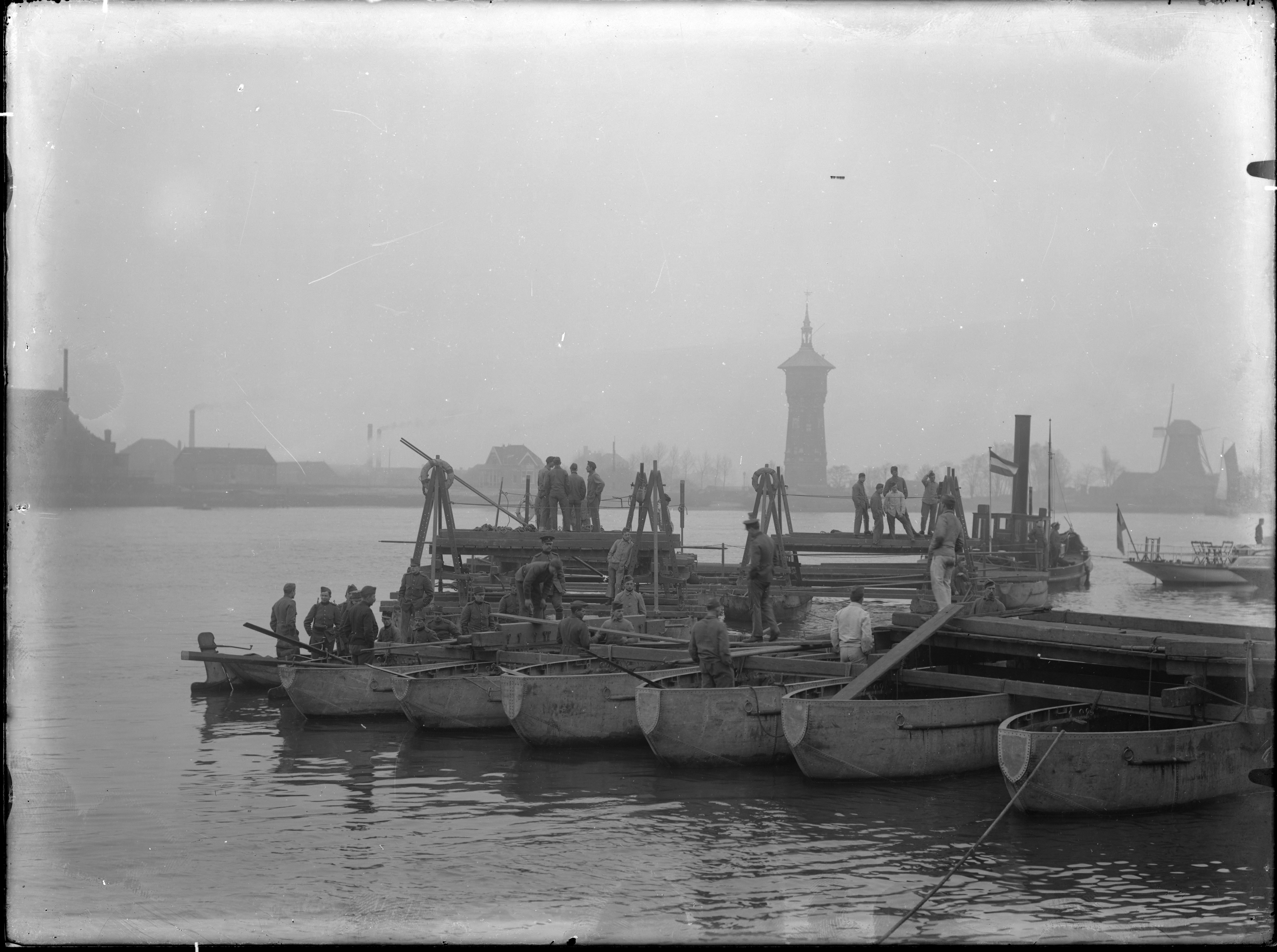 - Pontonniers bouwen een pontonbrug over de Oude Maas naar Zwijndrecht. Op de achtergrond de watertoren en molen Welgelegen.