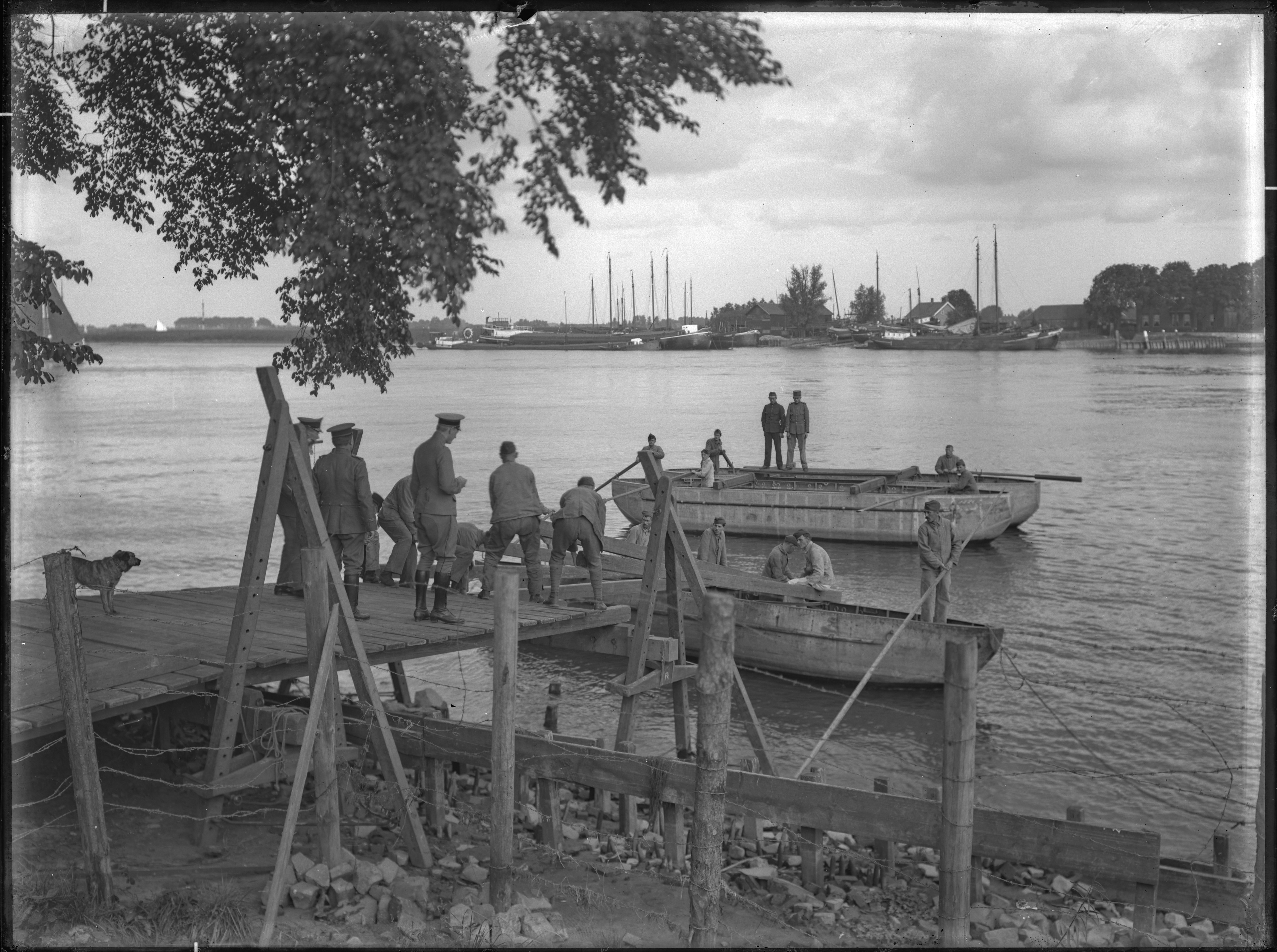 - Oefeningen van het Korps Pontonniers (Bruggendepot) op de Beneden Merwede tussen Dordrecht (voorgrond, punt van de Staart) en Papendrecht.