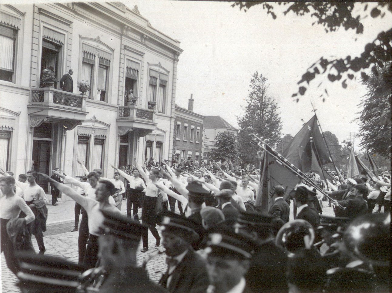 Optocht voor de woning van burgemeester De Gaay Fortman op de Dubbeldamseweg Noord.