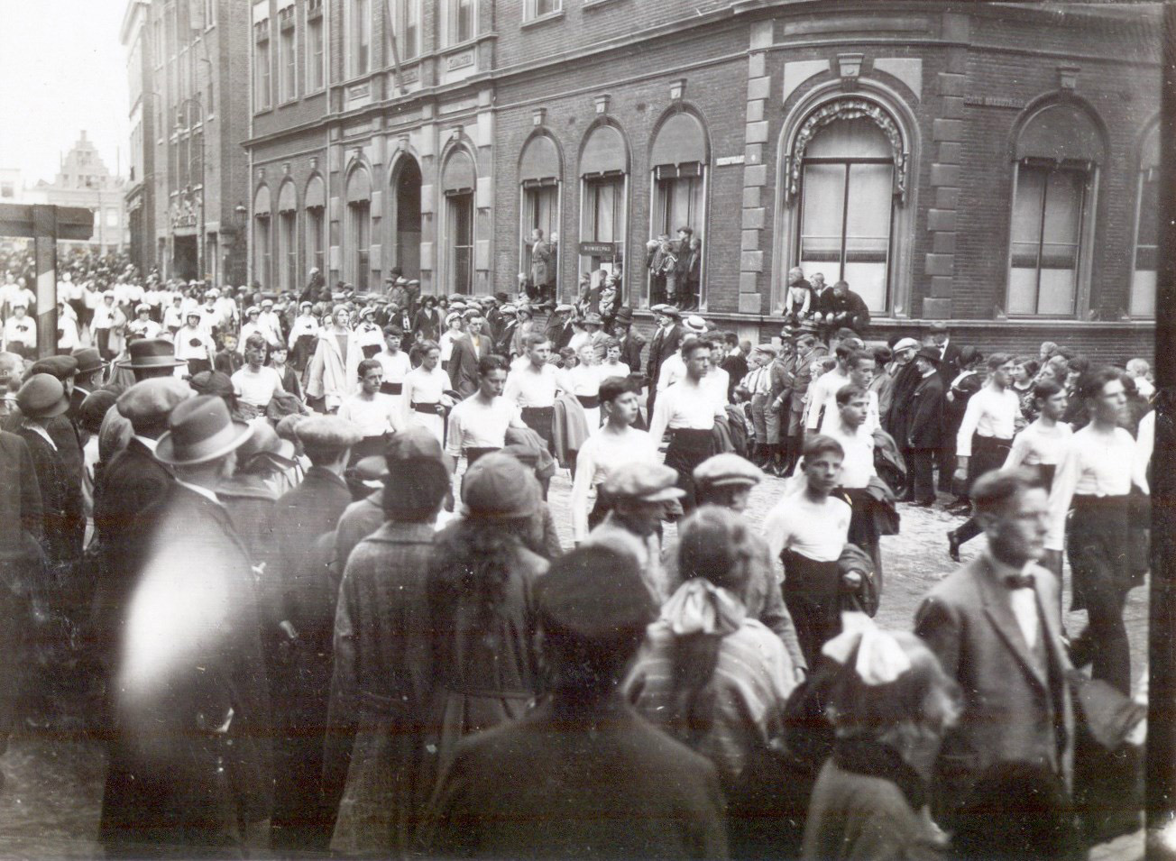 Optocht op 2e Pinksterdag in de Visstraat bij het kadaster op de hoek van de Korte Breestraat.