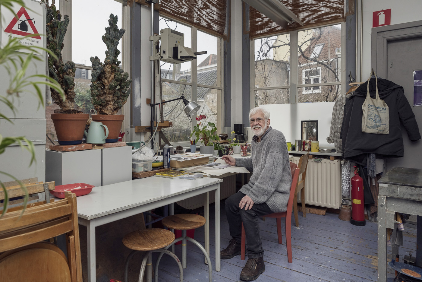 Beeldend kunstenaar Ad Koomans in de de grafische werkplaats van gebouw Pictura aan de Voorstraat.