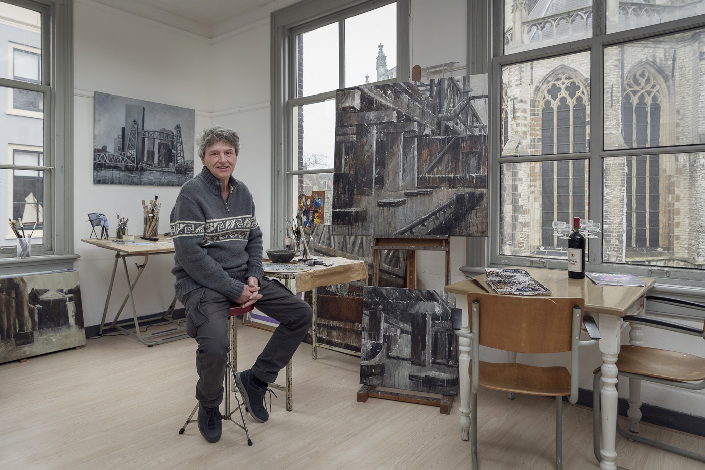 - Adrie Hello in zijn atelier op het Grotekerksplein.