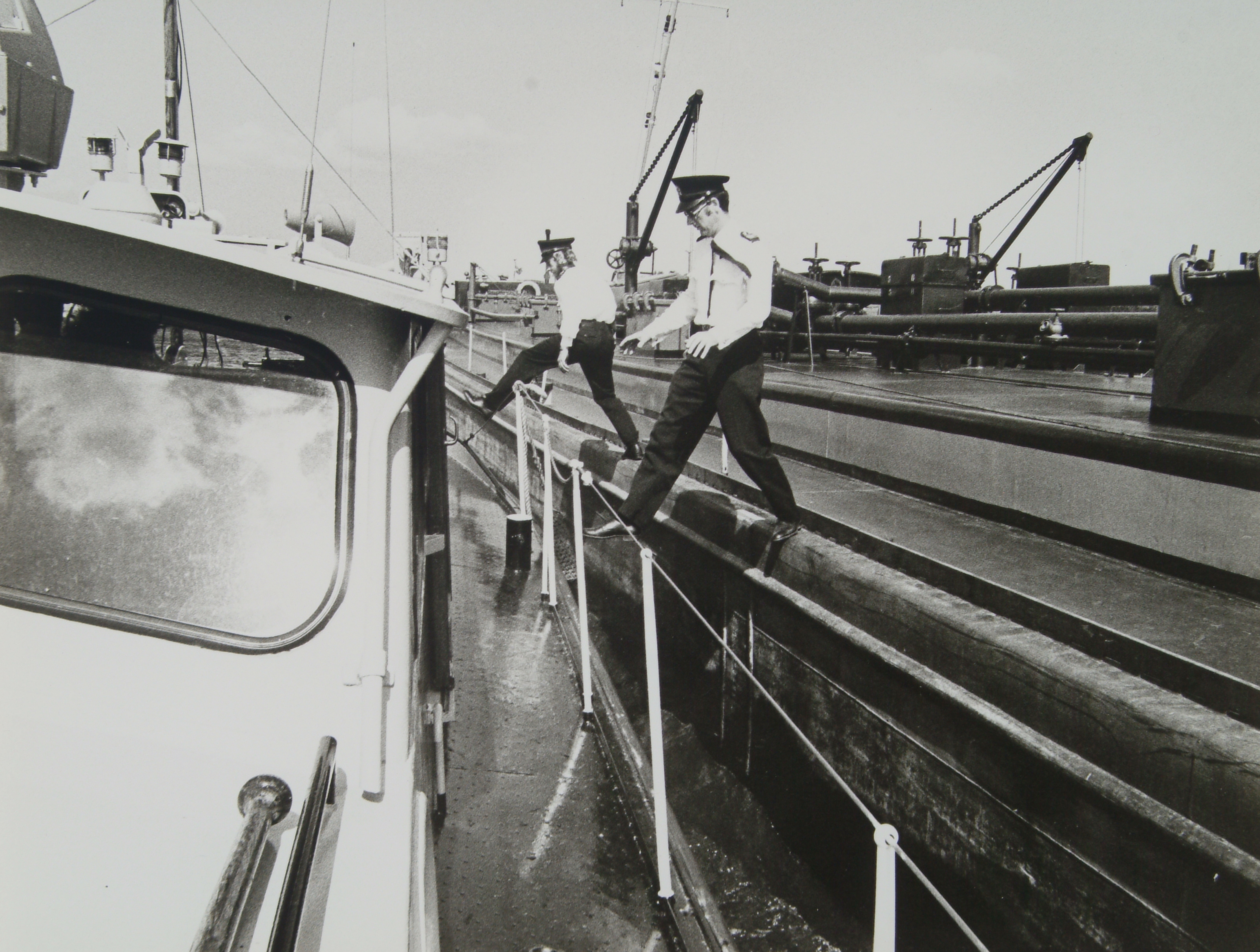 - Wachtmeesters van de Rijkspolitie te Water gaan vanaf een tanker aan boord van hun eigen vaartuig.