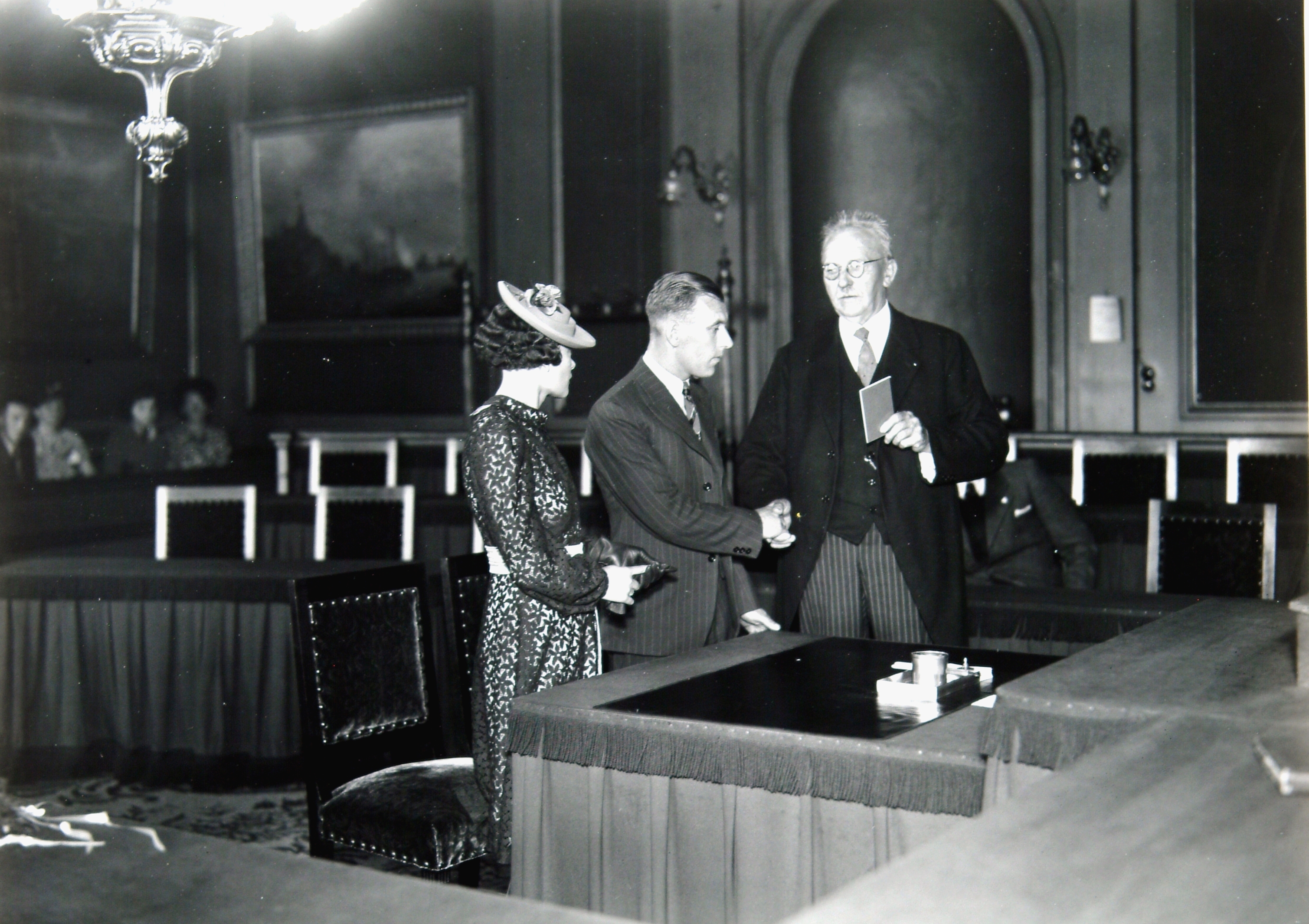 Een ambtenaar van de Burgerlijke Stand overhandigt het trouwboekje aan een pasgetrouwd paar in de trouwzaal van het stadhuis.
