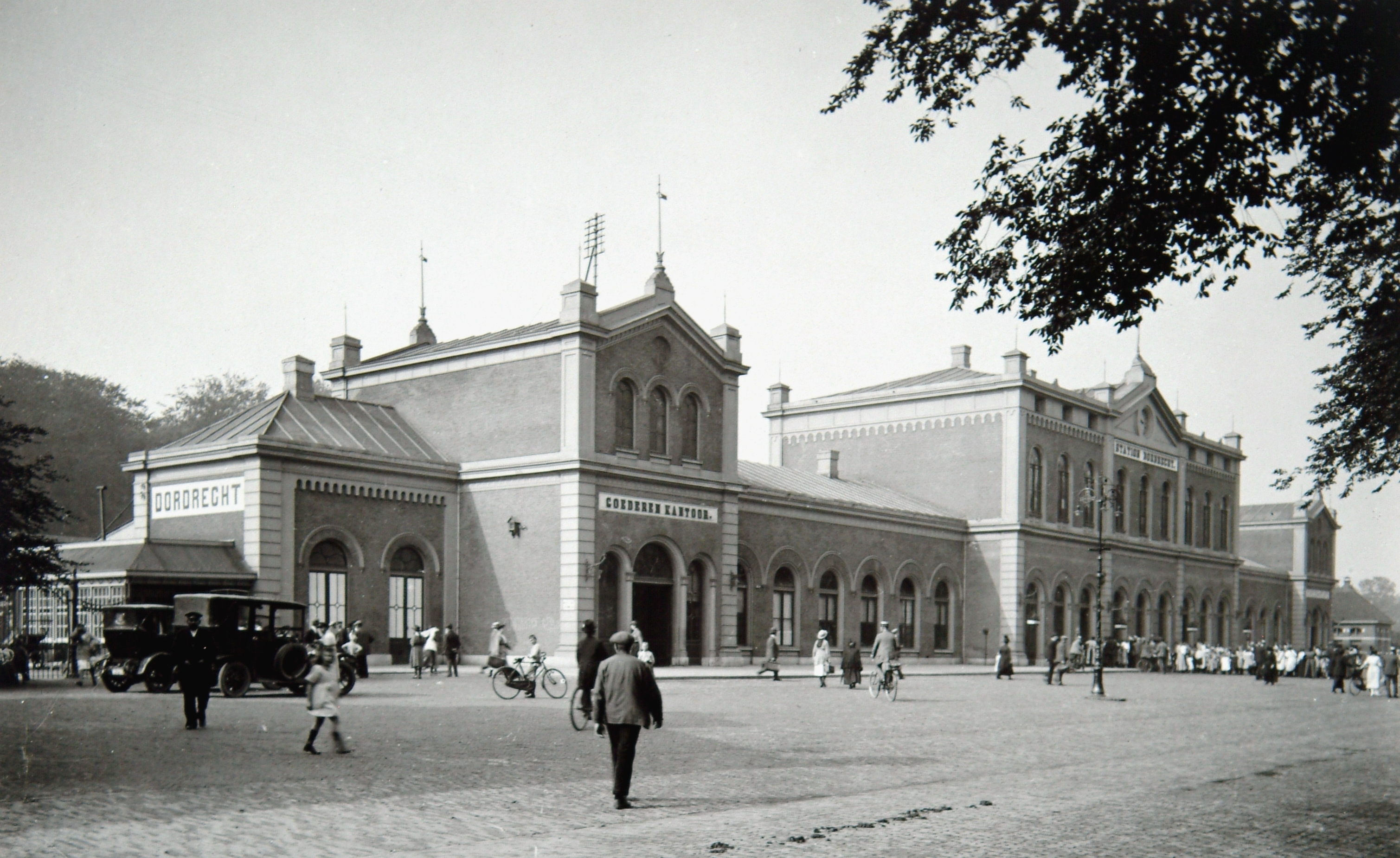 - Voor de hoofdingang van het station aan het Stationsplein wacht een lange rij mensen. Links bij de uitgang staan taxi's.