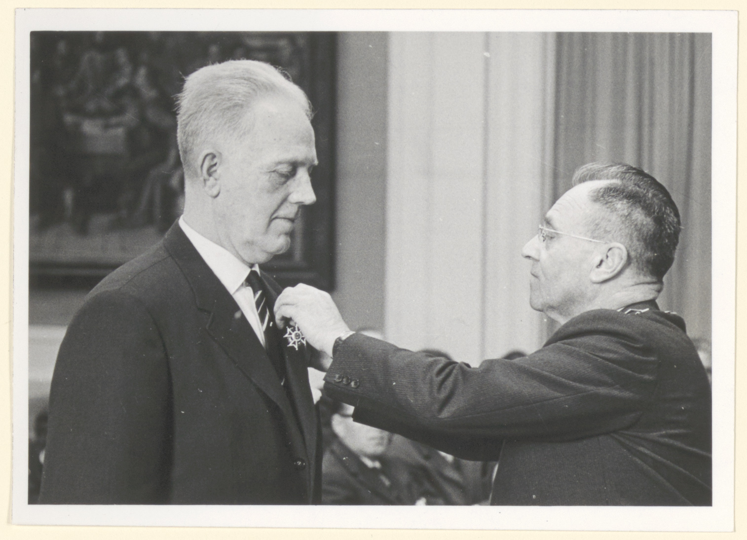 - Burgemeester Van der Dussen speldt politiecommissaris Heidema bij diens afscheid een ridderorde op.