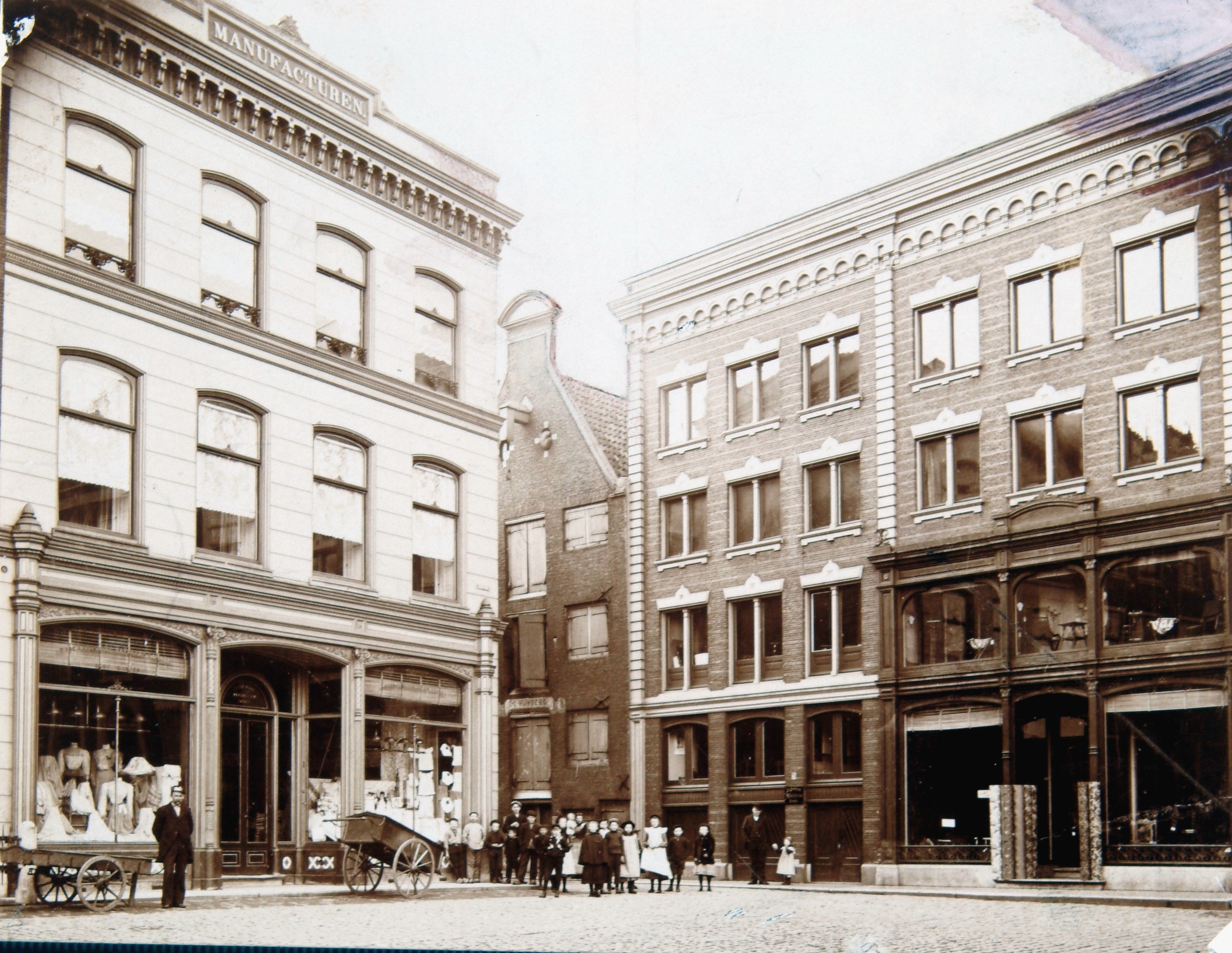 - Links het Vlak, rechts de Wolwevershaven. De straat naar links is de Binnen Walevest. Het gebouw met de halsgevel heet "De Wijnberg". In de panden ernaast werden woningtextiel en bedden verkocht.