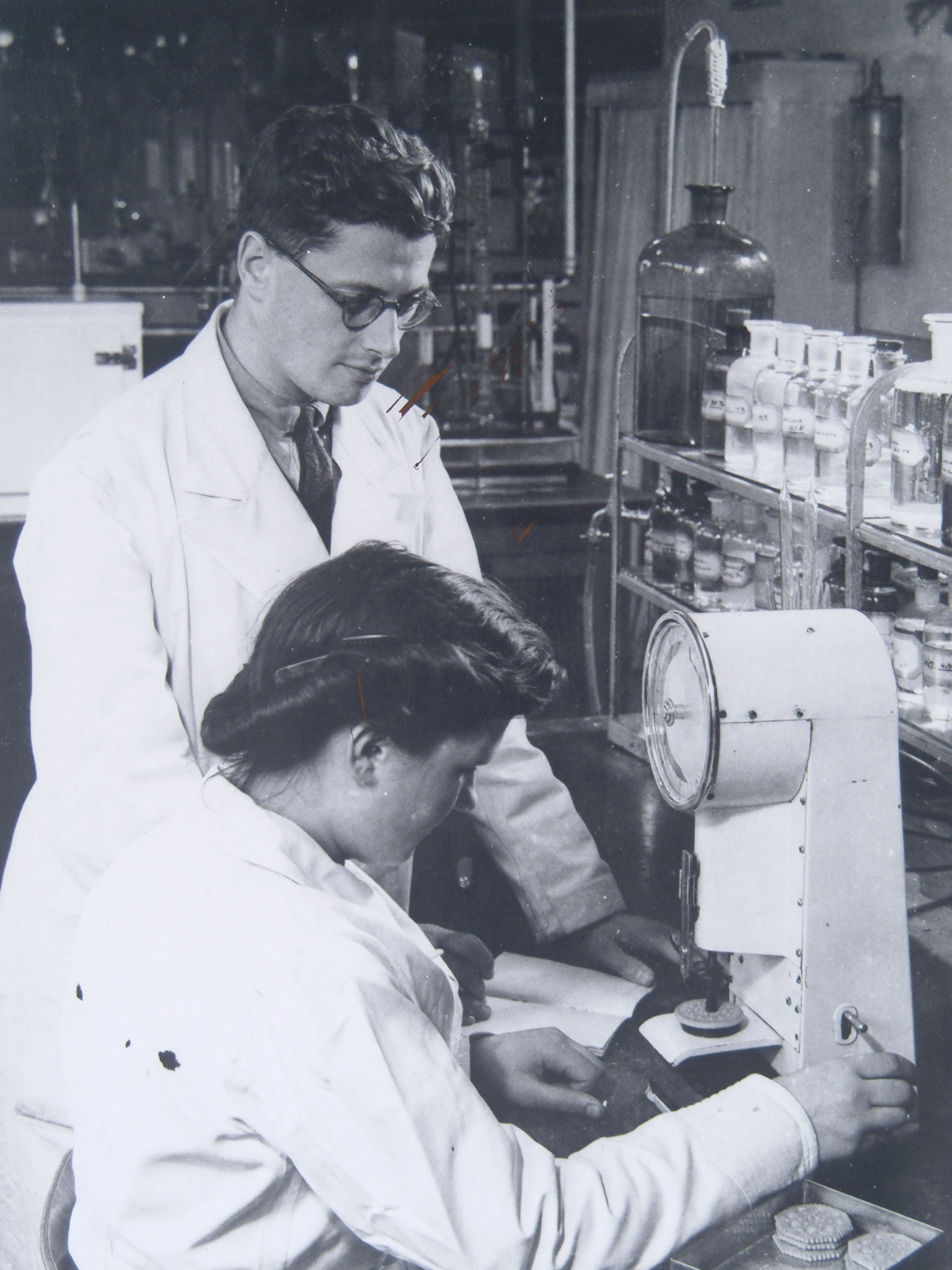- Werknemers aan het werk in het laboratorium van de Chocolade- en biscuitfabriek Victoria aan de Korte Parallelweg