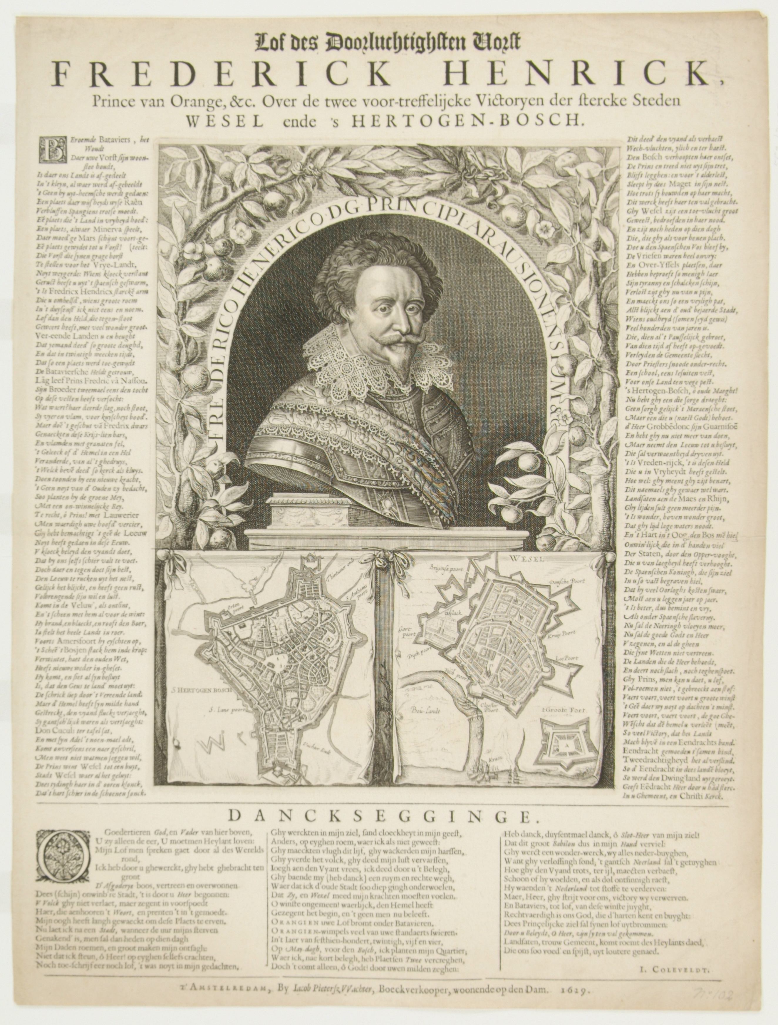 - Portret van Frederik Hendrik; eronder plattegronden van 's Hertogenbosch en Wesel