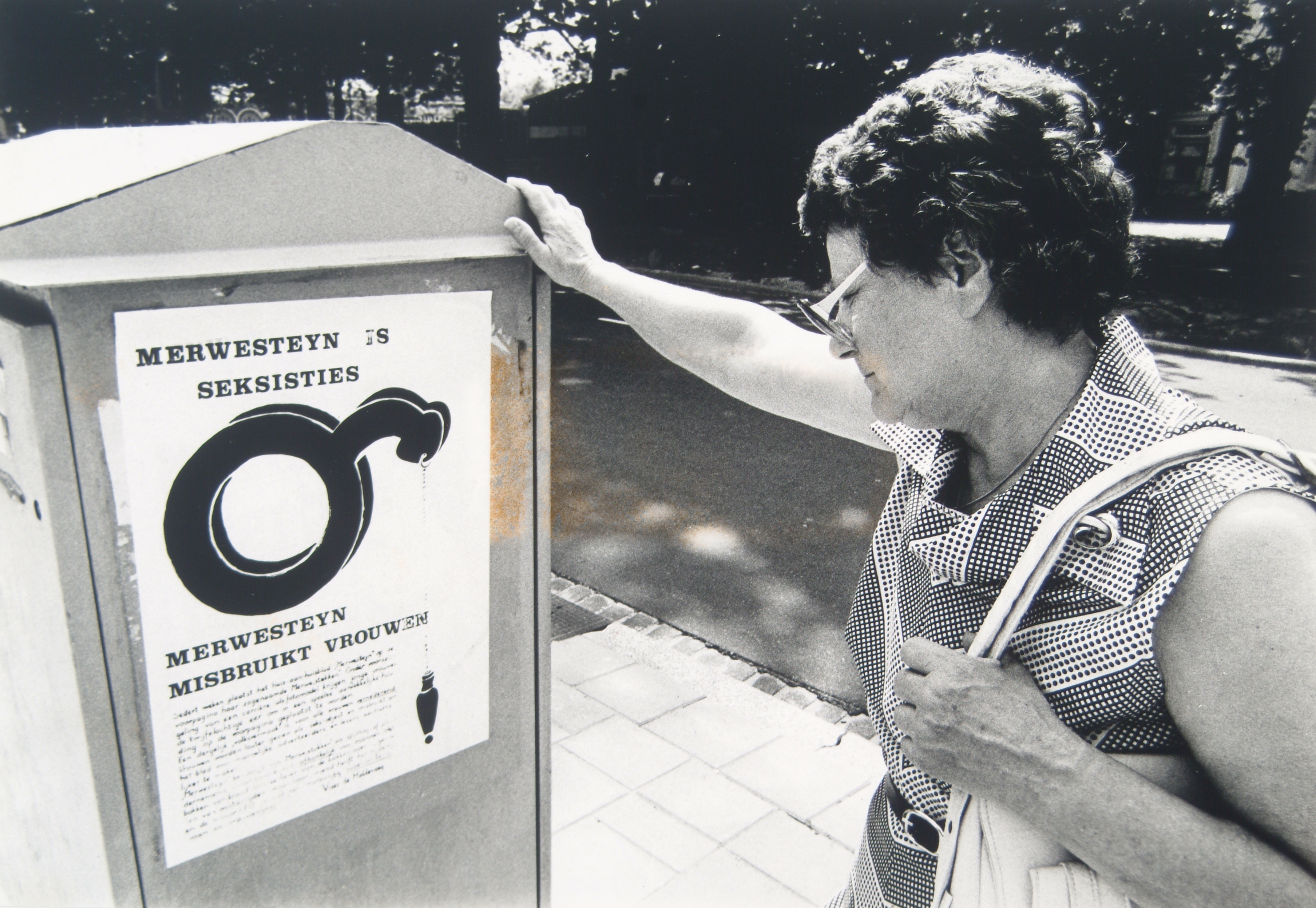 Mevrouw leest pamflet tegen seksistische plaatsingen van zgn. Merwestukken in het …