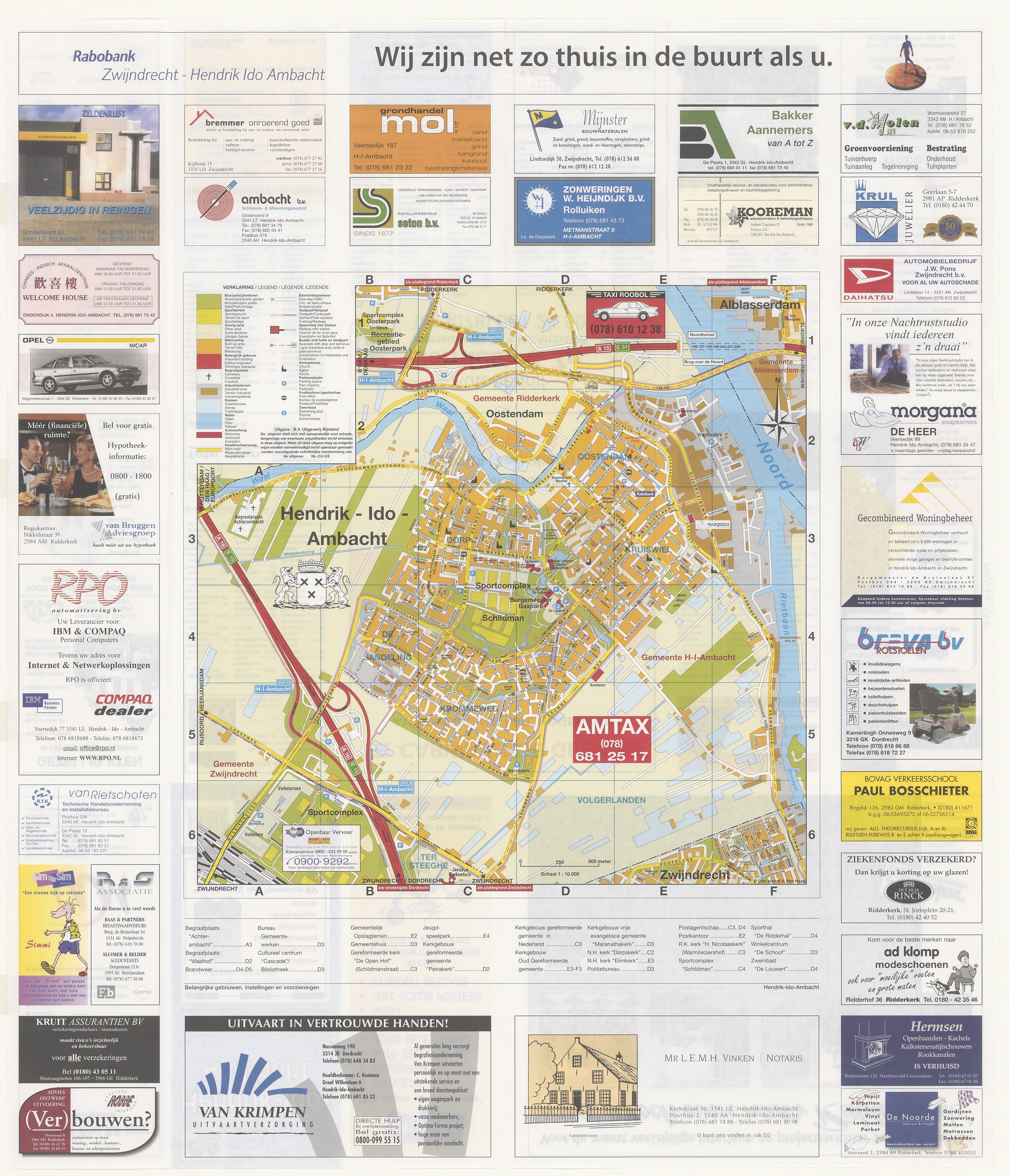 Plattegrond van Hendrik-Ido-Ambacht met legenda en randreclame.