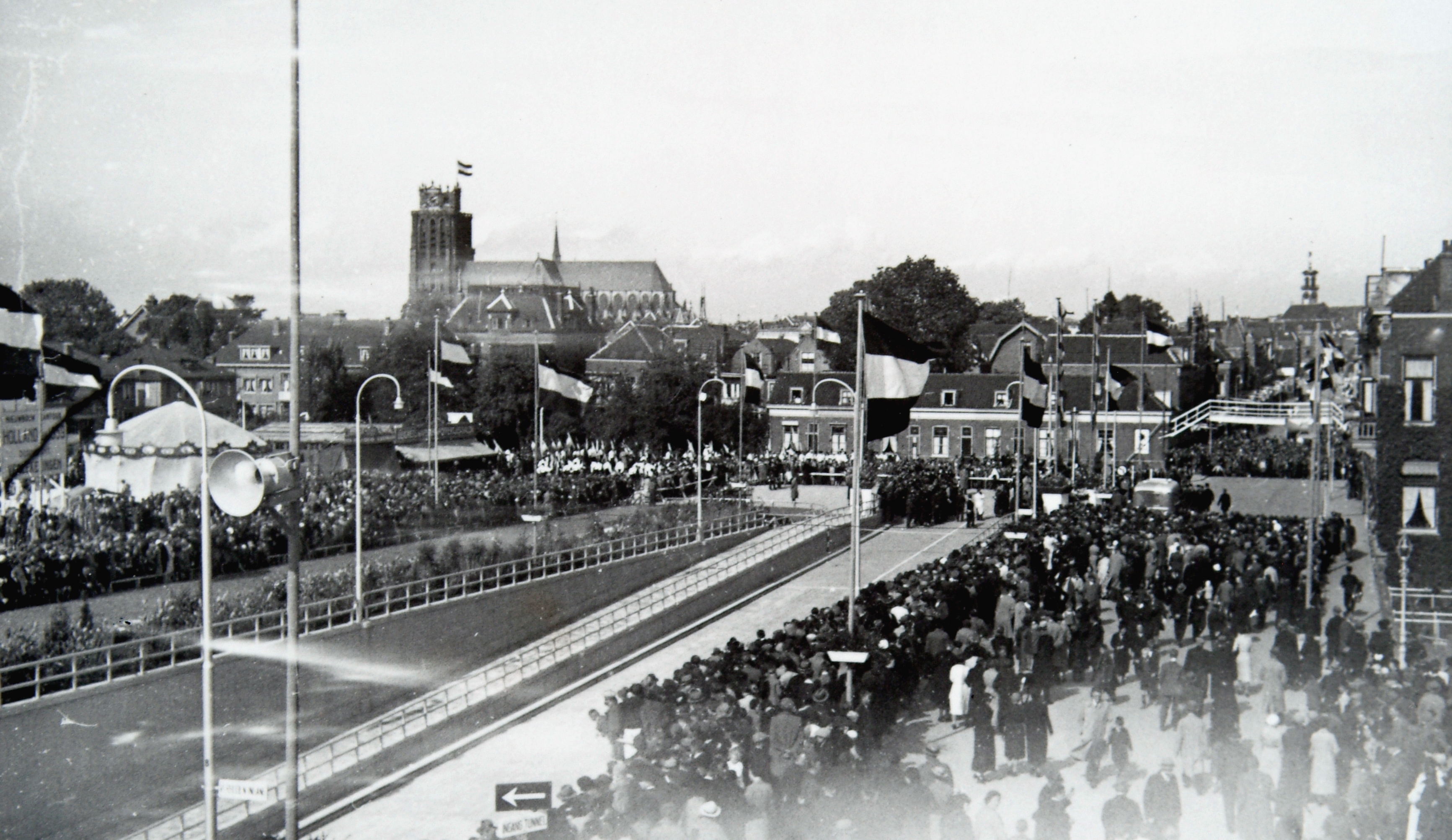 Autoriteiten en genodigden staan vlak voor de opening van de Krispijntunnel aan de zijde van de Spuiweg te wachten tot burgemeestersvrouw Bleeker het lint doorknipt.