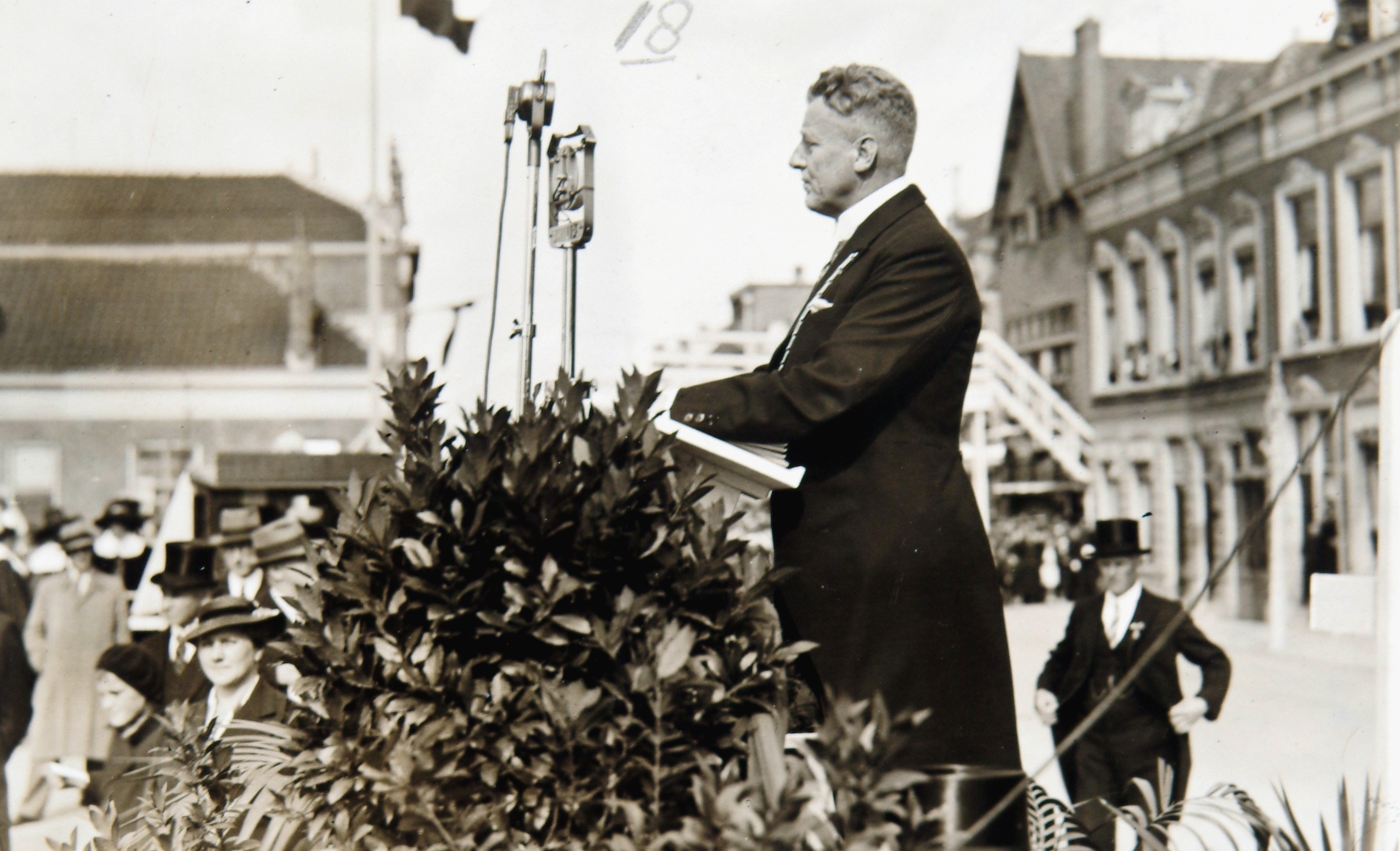 - Burgemeester Bleeker houdt op de Spuiweg zijn rede bij de opening van de Krispijntunnel voor de microfoon van de N.C.R.V.-radio.