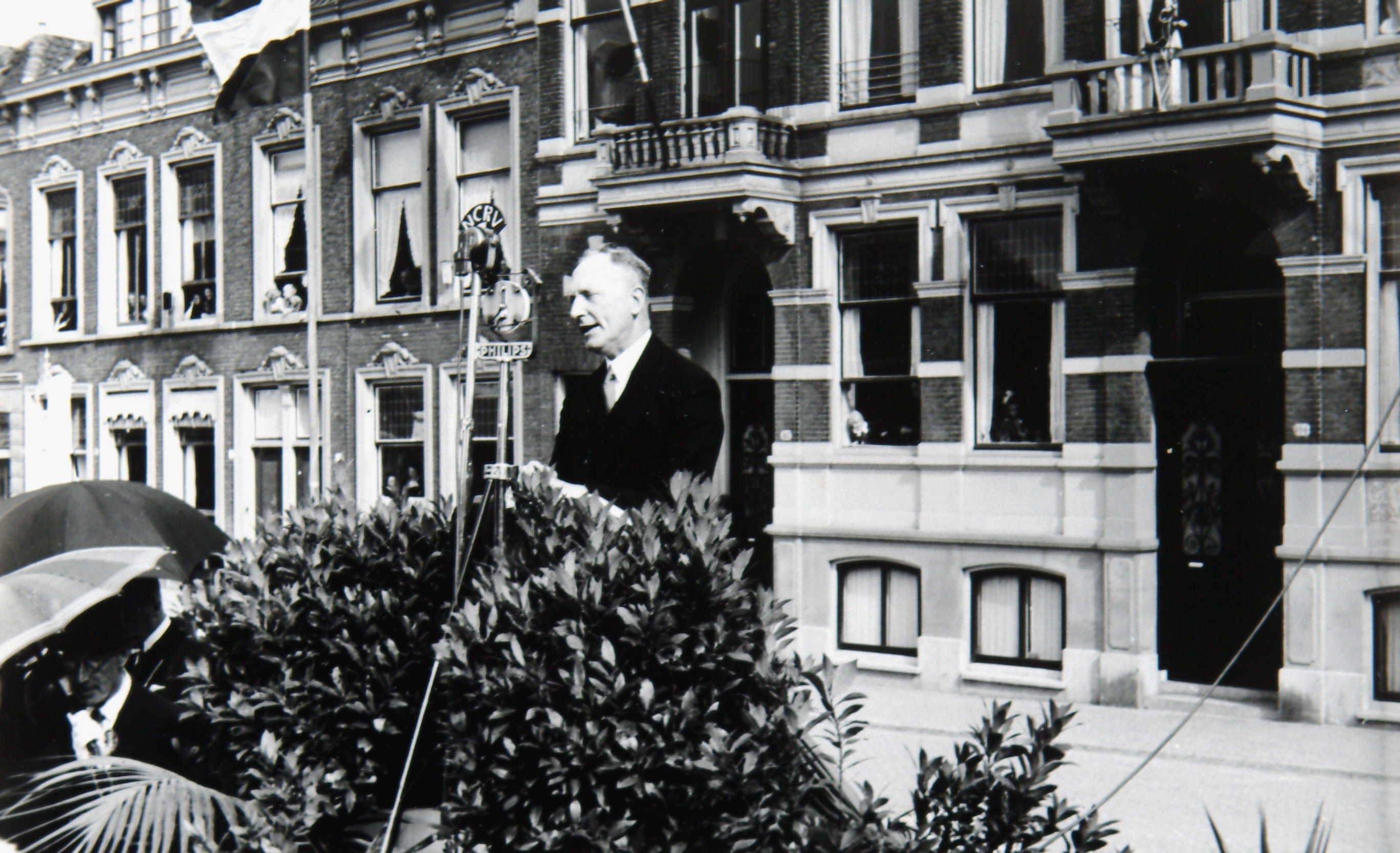 - Voorzitter De Witt van Krispijnbelangen houdt op de Spuiweg zijn rede bij de opening van de Krispijntunnel voor de microfoon van de N.C.R.V.-radio.