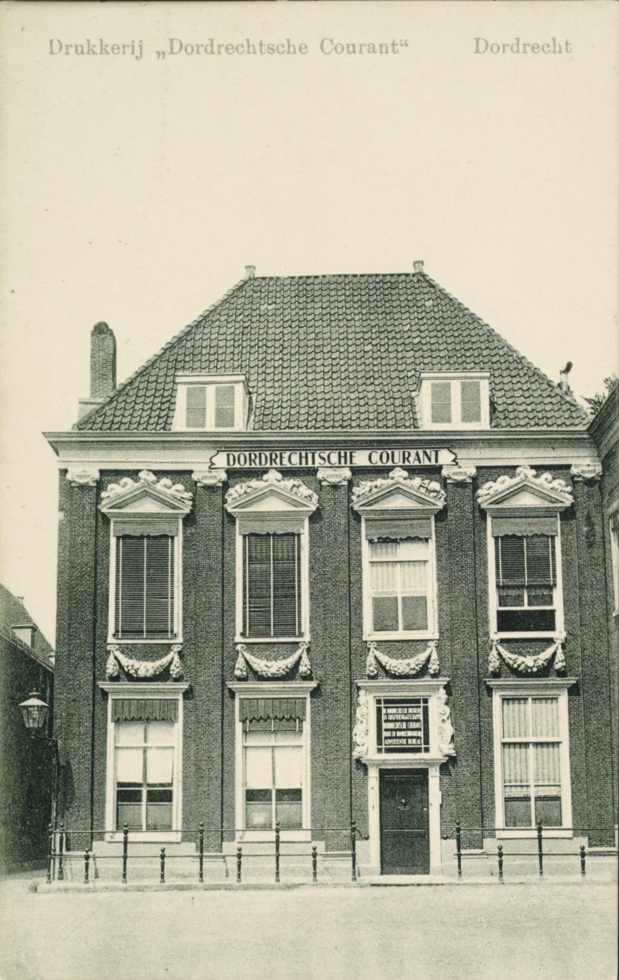 - Het Grotekerksplein, het gebouw van de drukkerij "Dordrechtsche Courant"