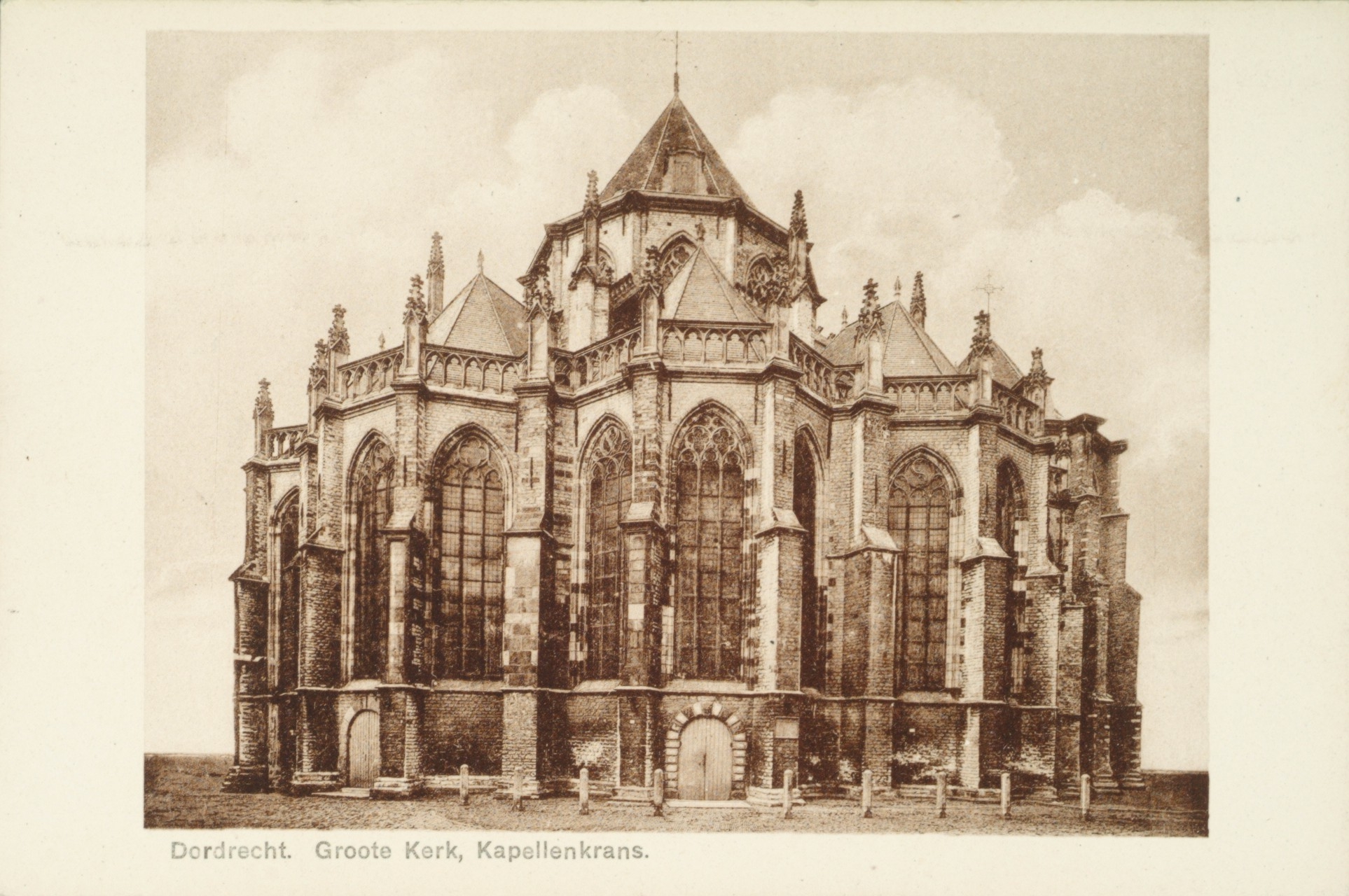 De Grote Kerk met koor en kapellenkrans (oostzijde), gezien vanaf het Grotekerksplein.