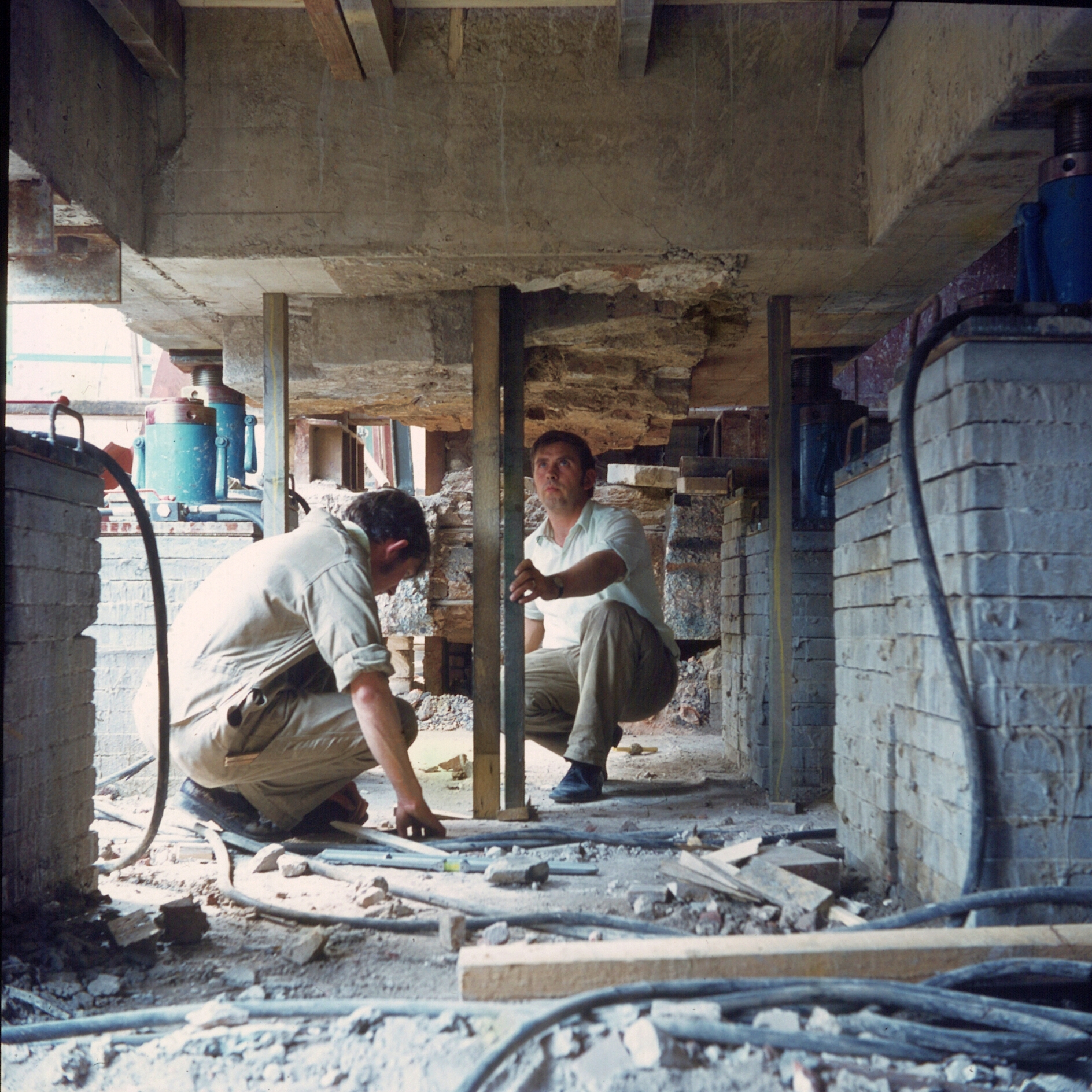 De werkzaamheden tijdens de restauratie van de Groothoofdspoort.