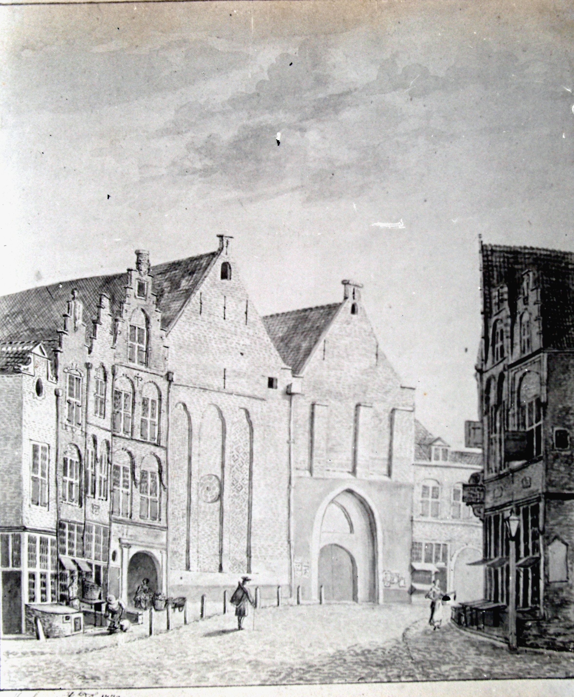 Augustijnenkerk op de Voorstraat met huizen op de hoek van het Steegoversloot (links). Tekening door J. Hoolaart (30,5x26 cm).