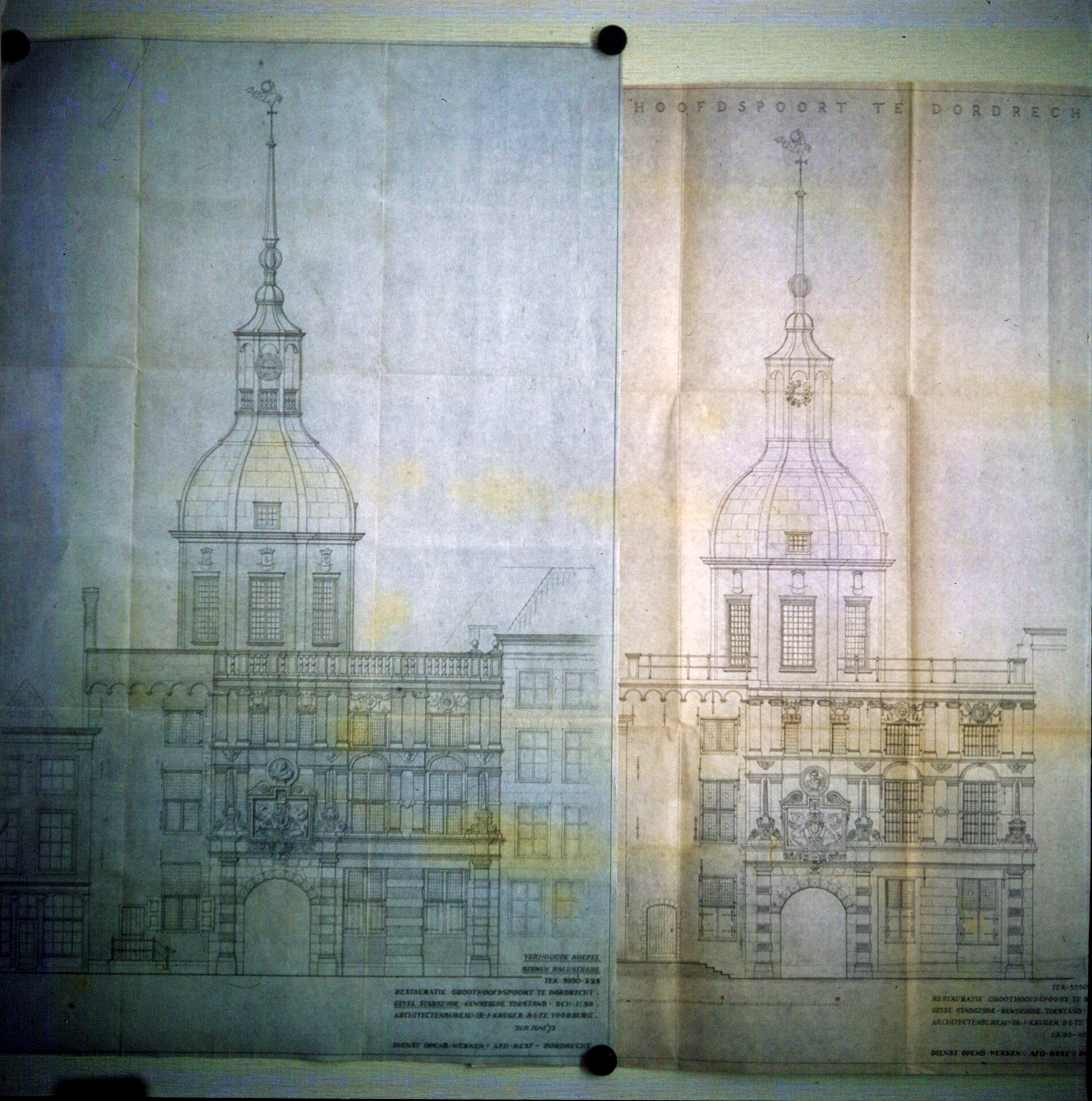 Bouwkundige tekening van de Groothoofdspoort, landzijde.