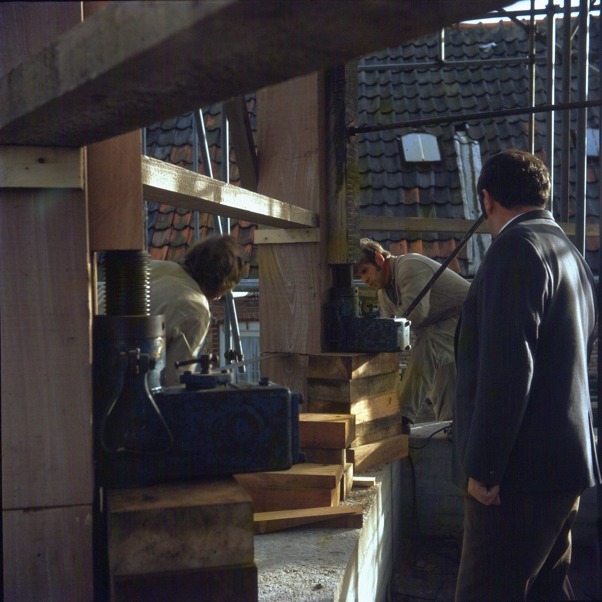 Werkzaamheden aan de koepel van de Groothoofdspoort, tijdens de restauratie.
