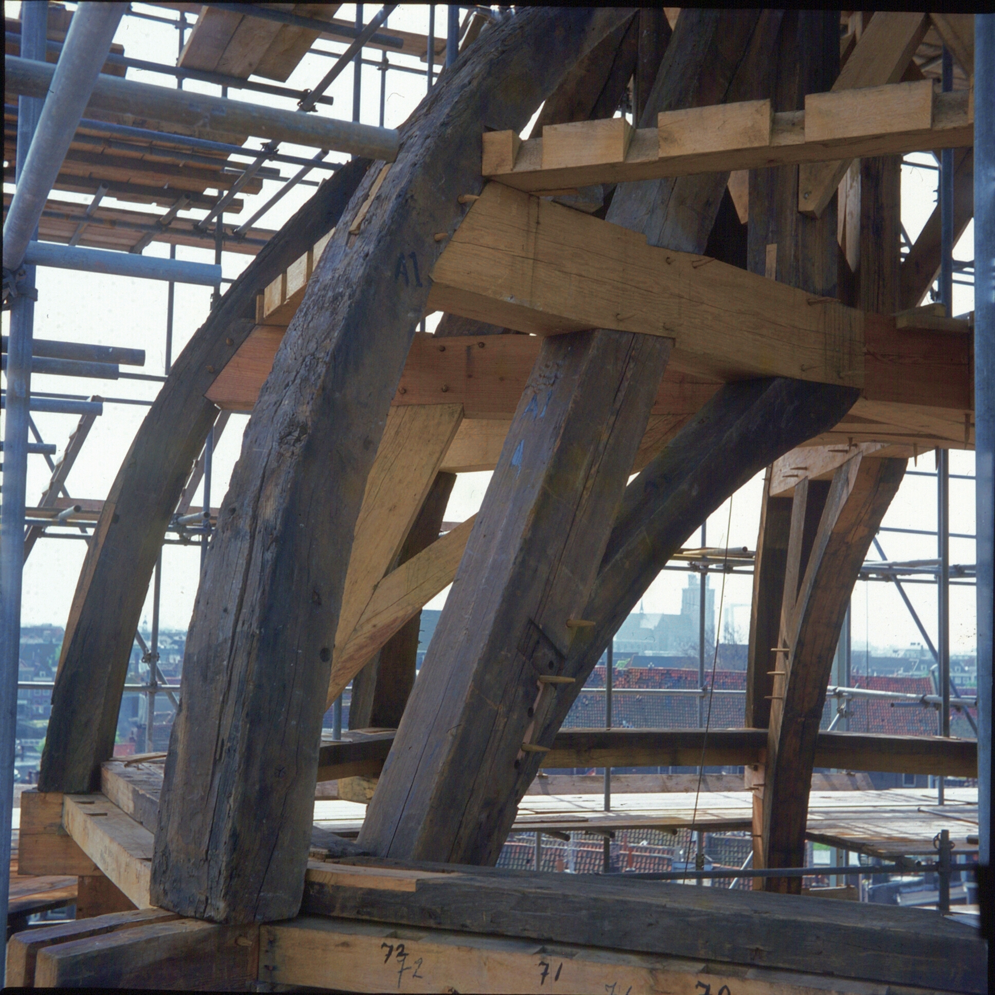- Het geraamte van de koepel tijdens de restauratie van de Groothoofdspoort.