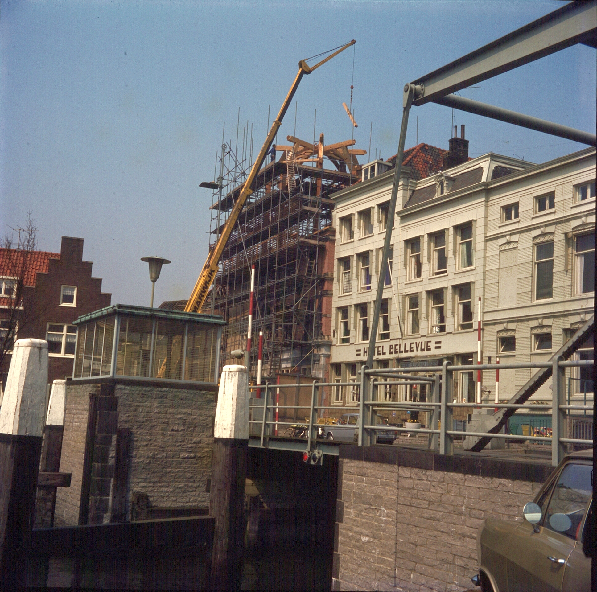 - Met een kraan worden de bouw- elementen naar boven gebracht voor de voltooiing van de koepel tijdens de restauratie van de Groothoofdspoort.