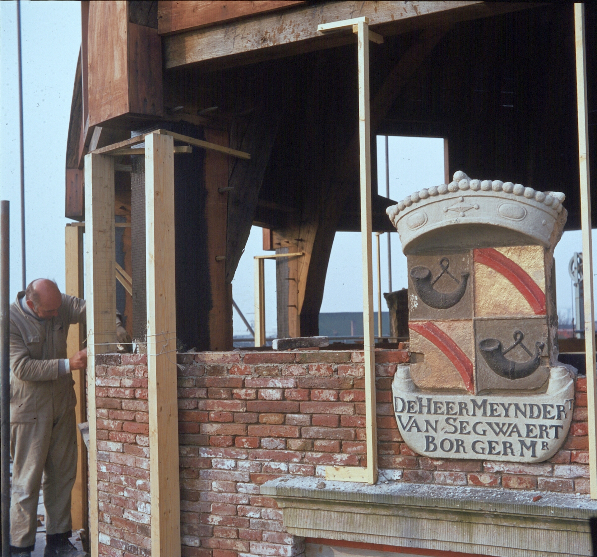- De voortgang van de werkzaamheden aan de koepel van de Groothoofdspoort, het wapen van dhr. Meyndert van Segwaert in 1693 regerend burgemeester te Dordrecht is al zichtbaar.