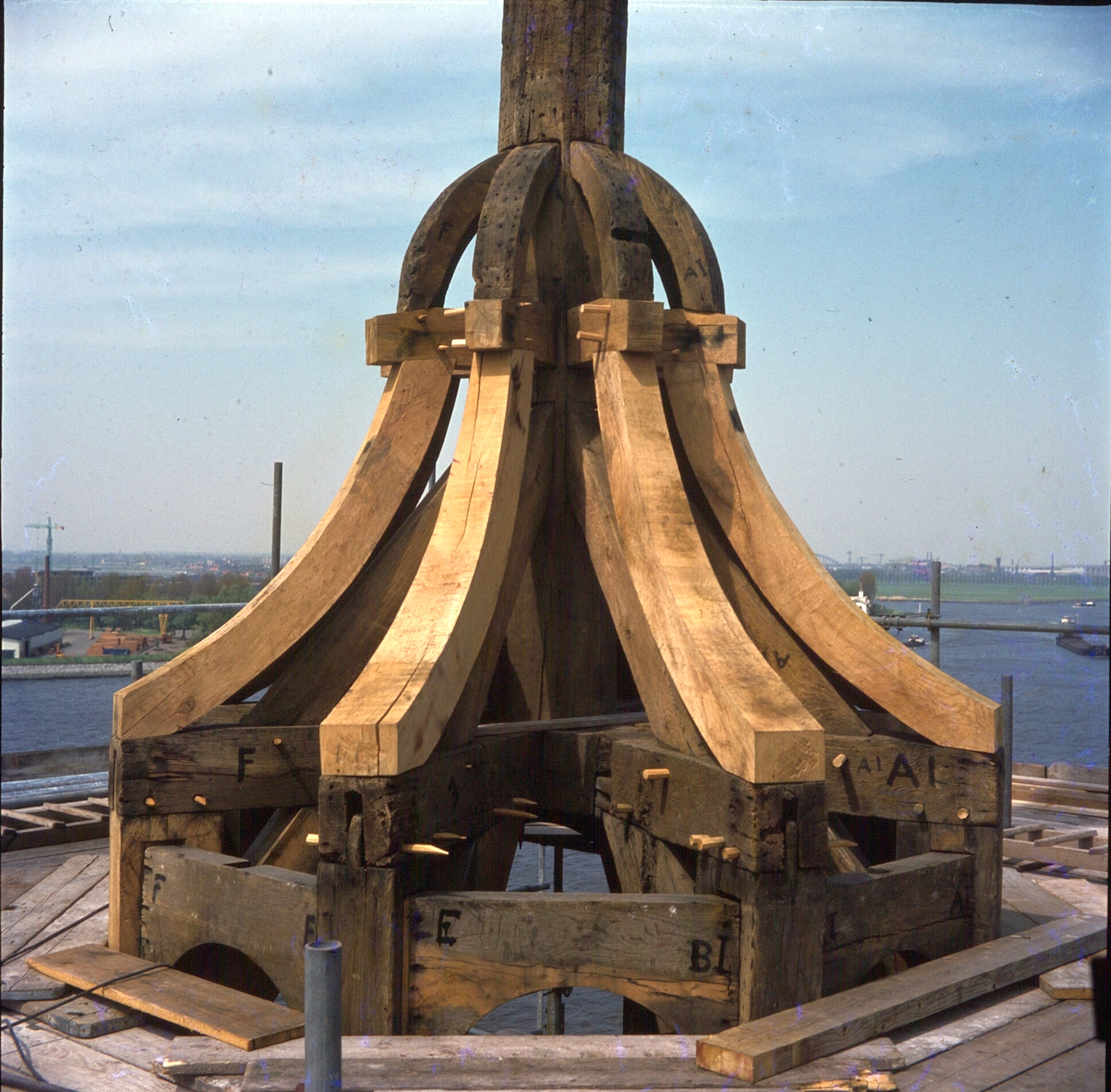 De bovenkant van de koepel van de Groothoofdspoort tijdens de restauratie.