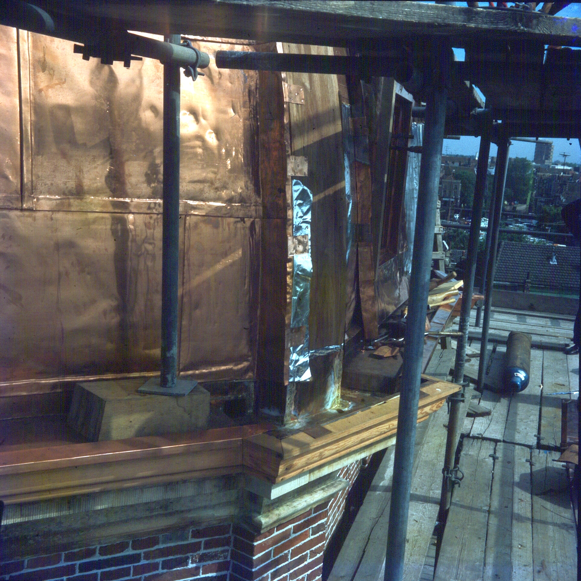 Het bekleden van de koepel tijdens de restauratie van de Groothoofdspoort.