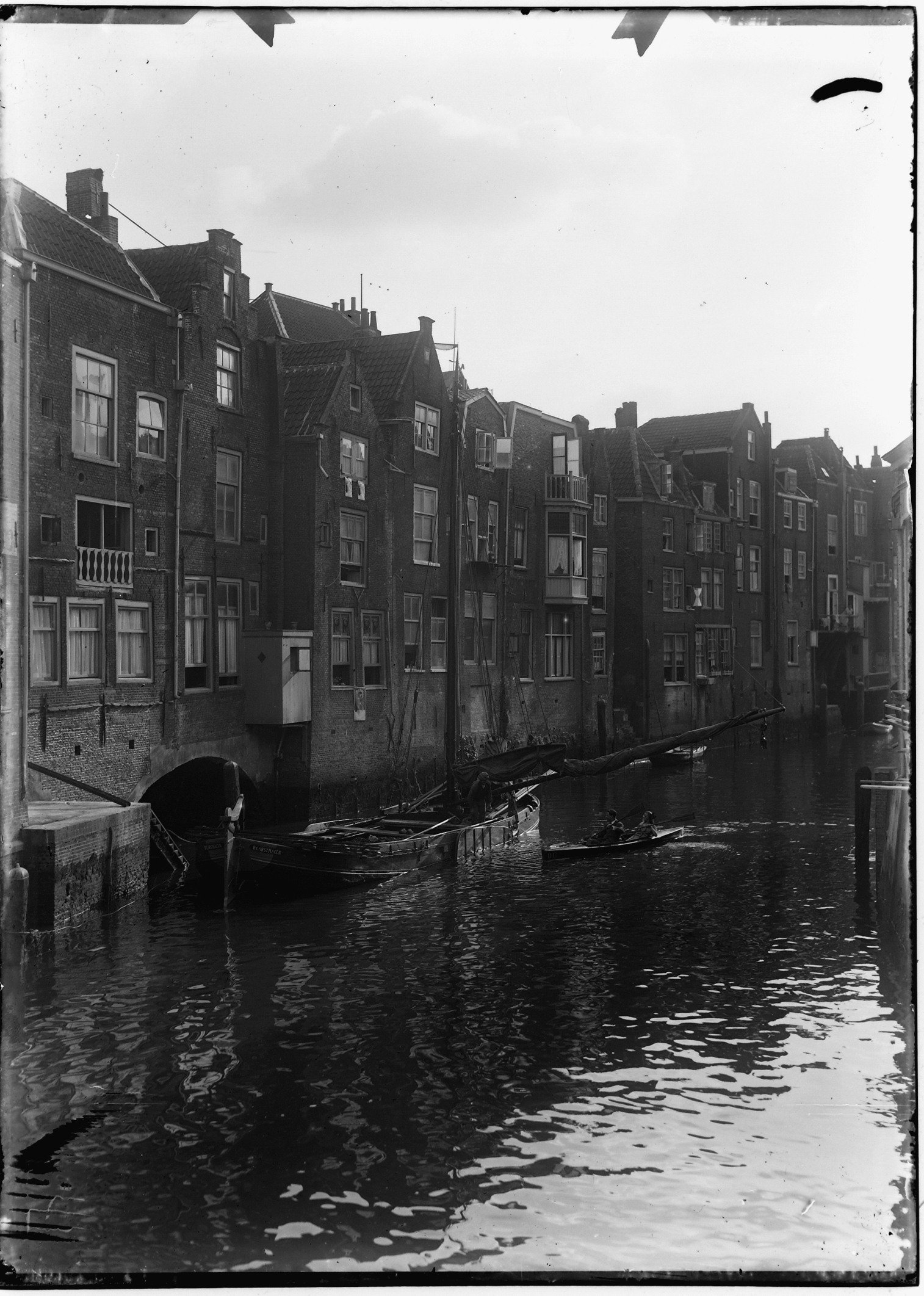 De Voorstraatshaven tussen Lombardbrug en Pelserbrug. Links op de voorgrond de Spuisteiger, daarnaast een vroegere verbinding met de Belgracht waardoor men tot de sluis kon varen. Een baggeraar is bezig met uitdiepen. De huizen staan aan de Voorstraat.