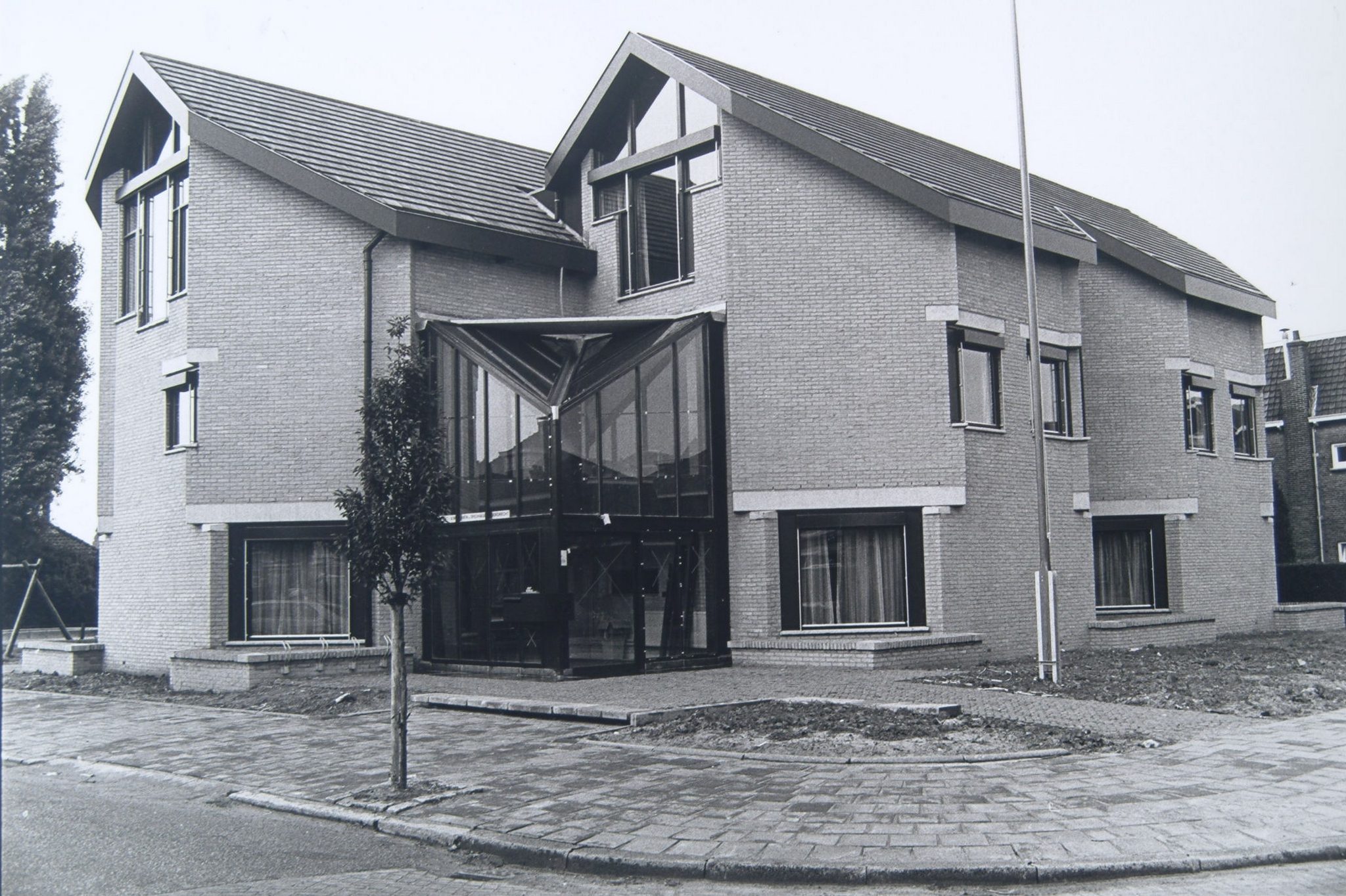 Kantoor van de stichting Gecombineerd Woningbeheer te Zwijndrecht op de hoek Lindelaan (links) en Burgemeester de Bruïnelaan.