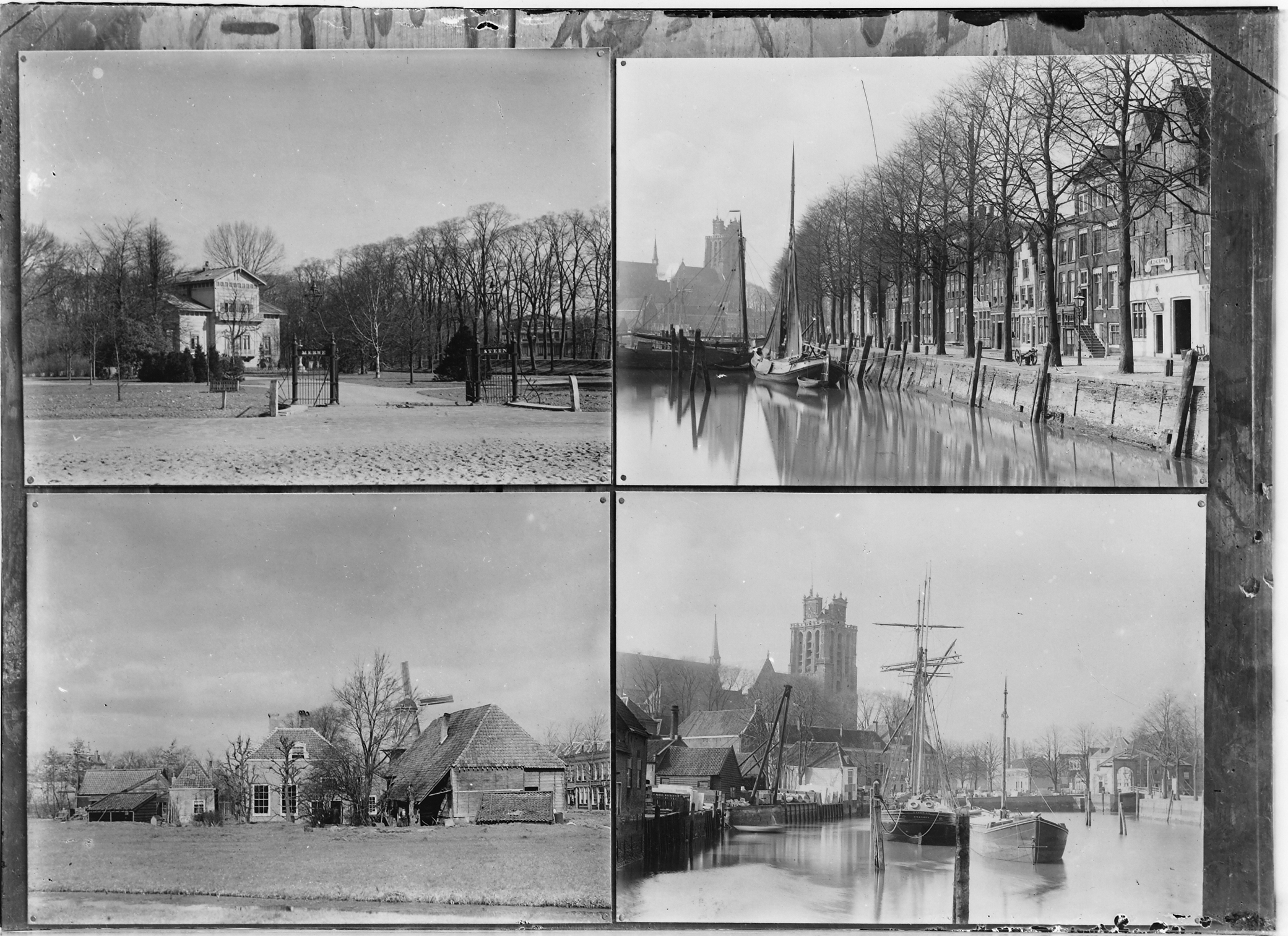 - Vier foto's. 1)Merwesteinpark met villa Merwestein 2)Nieuwe Haven en de Grote Kerk 3) boerderij met molen met rijhuizen onbekend waar 4)Nieuwe Haven met de Grote Kerk en Engelenburgerbrug
